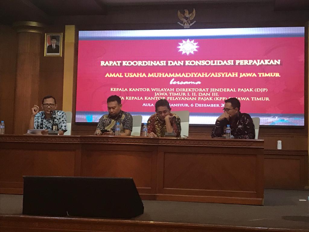 Pengurus Wilayah Muhammadiyah (PWM) Jawa Timur mengundang para Kepala Bidang P2humas dari Kanwil DJP Jawa Timur I, Kanwil DJP Jawa Timur II, dan Kanwil DJP Jawa Timur III dalam rapat koordinasi dan konsolidasi perpajakan yang digelar di Aula Mas Mansyur Kantor Wilayah Muhammdiyah Jawa Timur Jl. Kertomenanggal IV, Surabaya (Jumat, 6/12).