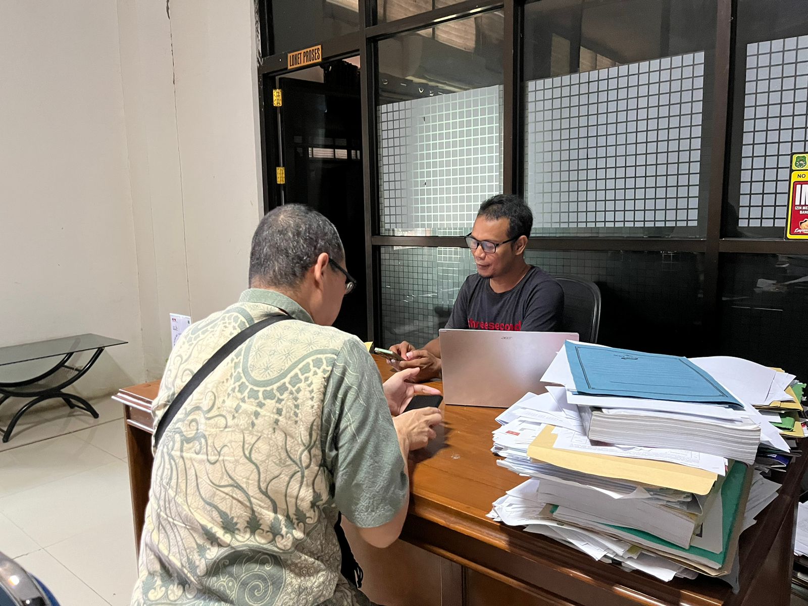 Kepala KP2KP Sidrap Hairul bersama dengan Pelaksana KP2KP Sidrap Reiza disambut baik oleh Saharuddin, Pelaksana bagian Pengelolaan Data Dinas PM-PTSP menyambut baik kedatangan rombongan KP2KP Sidrap dan mempersilakan untuk memasuki ruangannya.