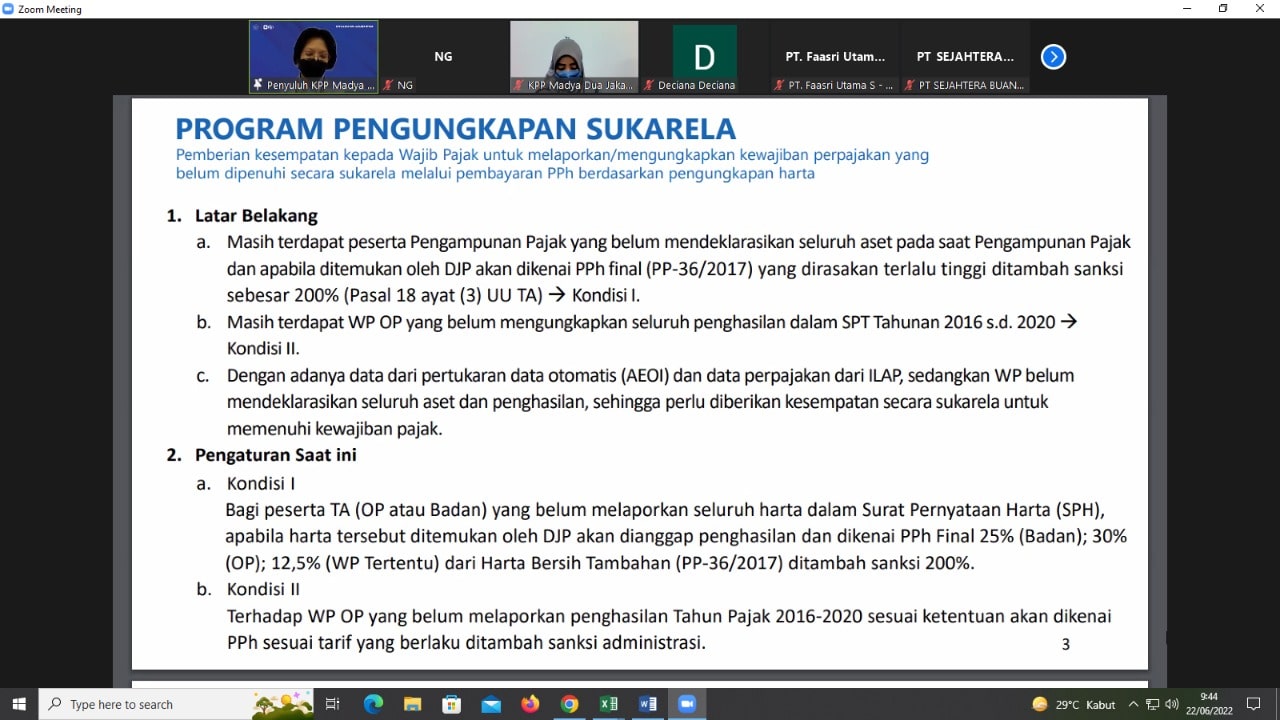 Kantor Pelayanan Pajak (KPP) Madya Dua Jakarta Utara menggelar kegiatan edukasi perpajakan terkait Program Pengungkapan Sukarela (PPS) secara dsaring melalui media Zoom Meeting, Jakarta Utara (Rabu, 22/6). Fungsional Penyuluh Pajak KPP Madya Dua Jakarta Utara M. Agata Dwiana Ekasari dan Ari Subroto menjadi narasumber pada kegiatan ini.