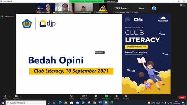 Kantor Wilayah Direktorat Jenderal Pajak (Kanwil DJP) Banten menggelar Club Literacy pertemuan perdana bersama para dosen dan mahasiswa dari tax center di Lingkungan Kanwil DJP Banten dengan tema Bedah Opini di Serang, Banten (Jumat, 10/9).