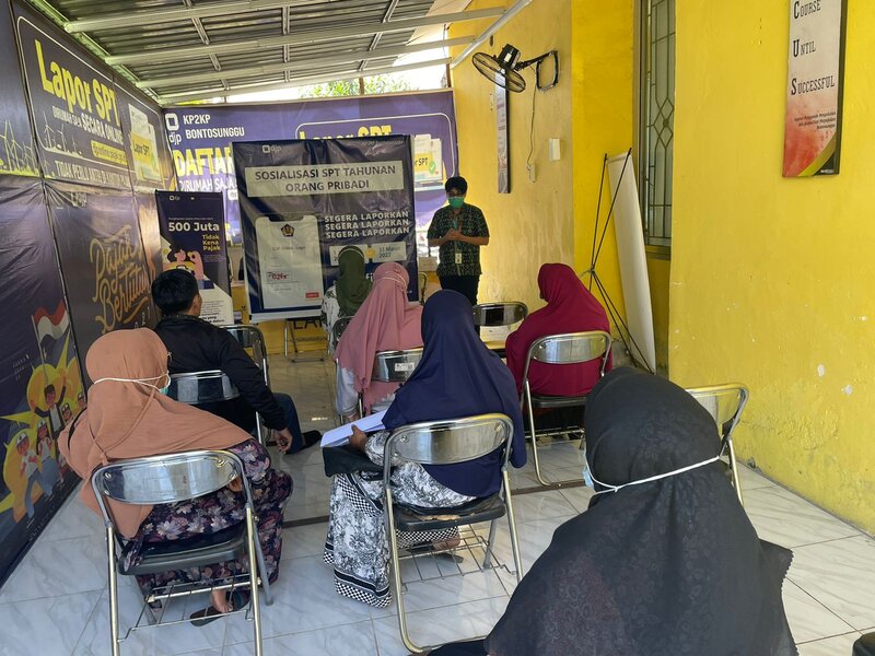 Kantor Pelayanan, Penyuluhan, dan Konsultasi Perpajakan (KP2KP) Bontosunggu melakukan kegiatan edukasi perpajakan kepada Wajib Pajak Orang Pribadi terkait pengisian Surat Pemberitahuan (SPT) Tahunan. Kegiatan ini dilaksanakan secara tatap muka di ruang konsultasi KP2KP Bontosunggu, Kabupaten Jeneponto (Jumat, 7/10).