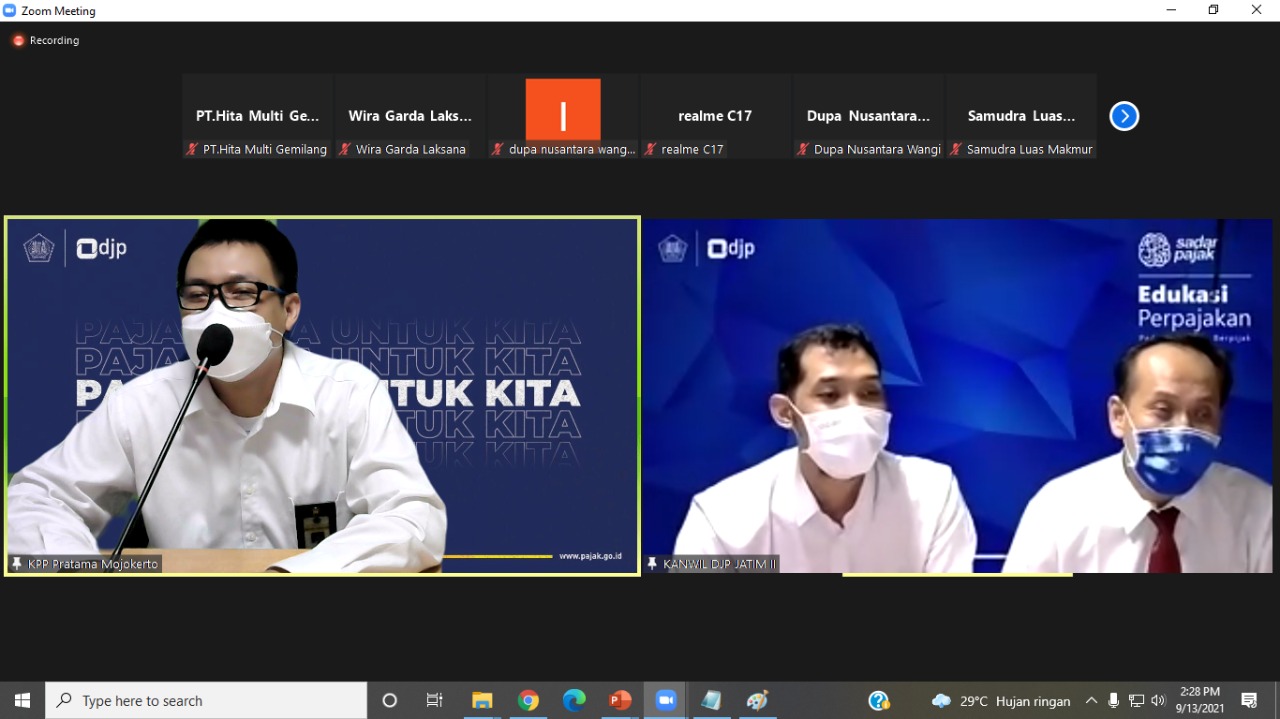 Tim Penyuluh Pajak Kantor Wilayah (Kanwil) DJP Jawa Timur II bersama Tim Penyuluh Pajak Kantor Pelayanan Pajak (KPP) Pratama Mojokerto menyelenggarakan edukasi perpajakan bagi wajib pajak strategis yang belum menyampaikan Surat Pemberitahuan (SPT) Tahunan. Acara dilangsungkan secara daring di KPP Pratama Mojokerto, Kabupaten Mojokerto mulai pukul 13.00 sampai 14.30 WIB (Senin, 13/9).
