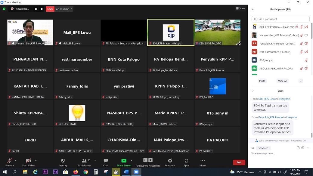Kantor Pelayanan Pajak (KPP) Pratama Palopo menyelenggarakan kegiatan edukasi perpajakan tentang e-Bupot Unifikasi PPh Pasal 21 untuk bendahara pemerintah (Kamis, 9/9). Kegiatan yang diikuti oleh perwakilan 25 instansi vertikal se-Kota Palopo dan Kabupaten Luwu ini dilangsungkan secara daring dari ruang rapat KPP Pratama Palopo, Kota Palopo.