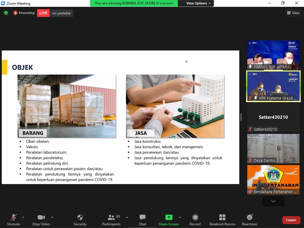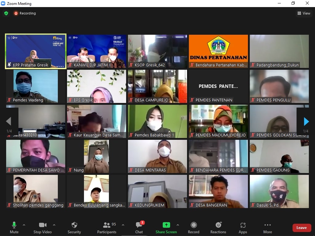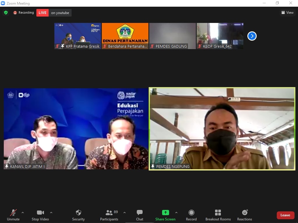 Kantor Pelayanan Pajak (KPP) Pratama Gresik berkolaborasi dengan Kantor Wilayah (Kanwil) DJP Jawa Timur II mengadakan kegiatan edukasi perpajakan terkait tata cara pembuatan bukti pemotongan/pemungutan pajak dan SPT Masa sesuai PER-17/PJ/2021. Kegiatan ini dilaksanakan secara daring di Gedung KPP Pratama Gresik, Kabupaten Gresik dan diikuti kurang lebih 90 Bendahara Instansi Pemerintah melalui media Zoom Cloud Meeting (Selasa, 7/9).