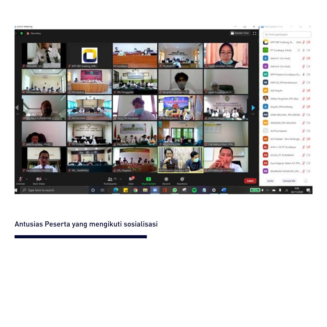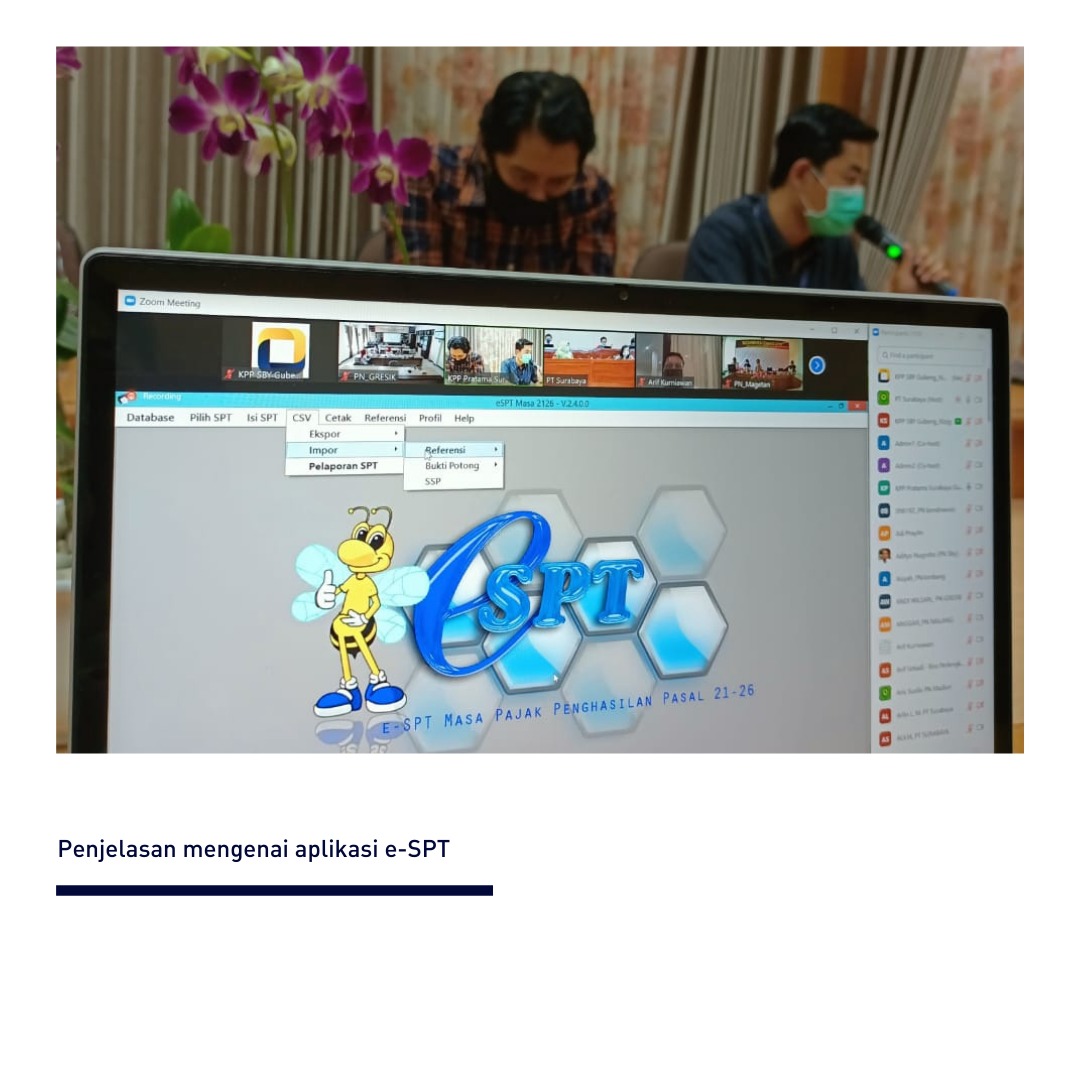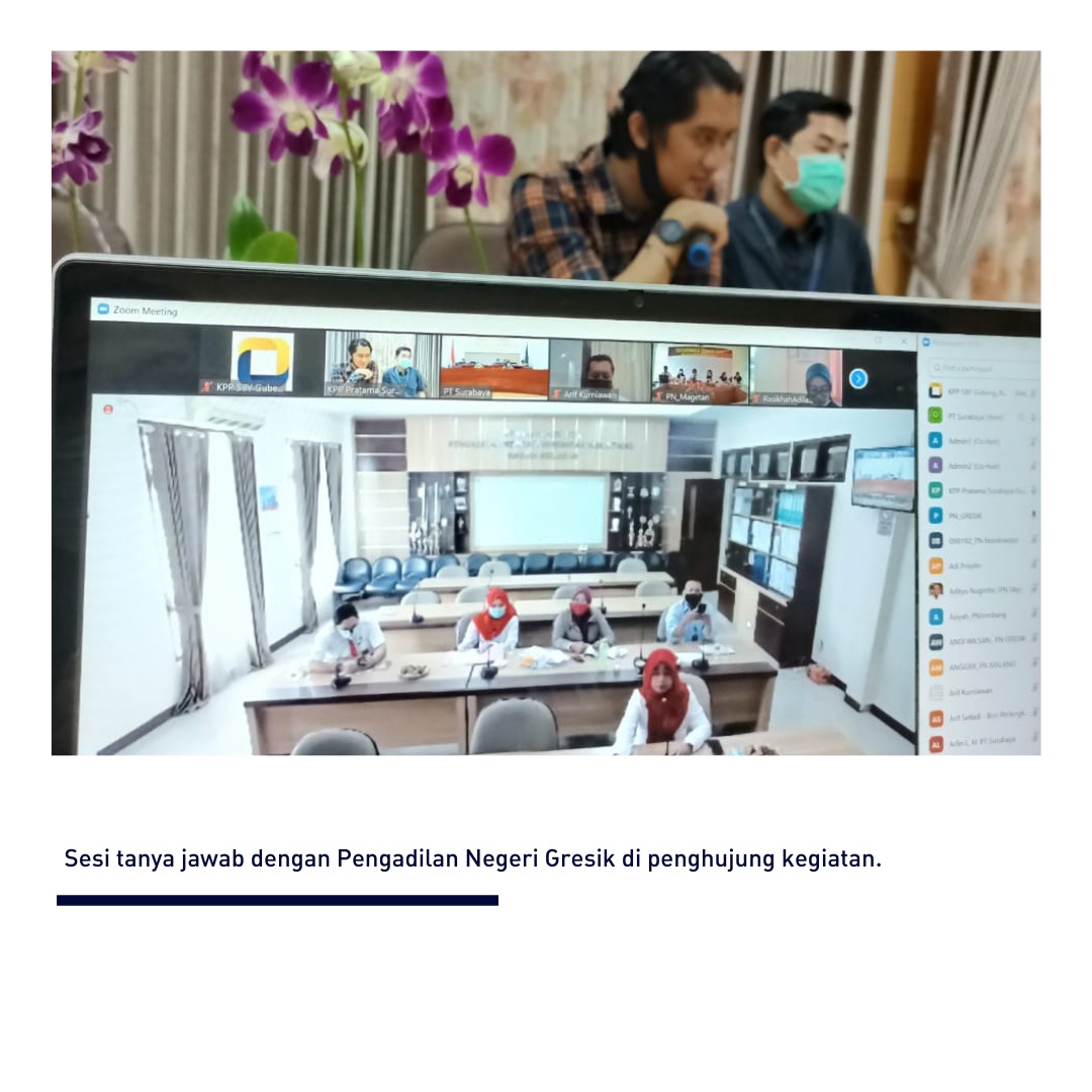 Kantor Pelayanan Pajak (KPP) Pratama Surabaya Gubeng bekerja sama dengan Pengadilan Tinggi Jawa Timur menyelenggarakan kegiatan Sosialisasi Kewajiban Perpajakan bagi Bendahara Pemerintah secara daring di Surabaya (Kamis, 26/11). Kegiatan ini diikuti oleh seluruh Bendahara Pengadilan Negeri di wilayah Provinsi Jawa Timur.
