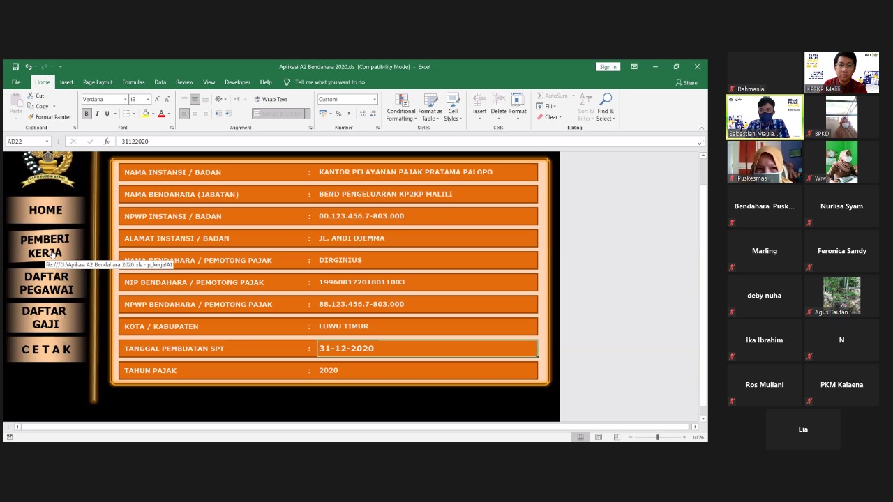 Kantor Pelayanan, Penyuluhan, dan Konsultasi Perpajakan (KP2KP) Malili mengadakan kegiatan Bimbingan Teknis pembuatan bukti potong A2 pada bendaharawan puskesmas (Selasa, 23/2). Kegiatan ini dilangsungkan secara daring melalui aplikasi Zoom Meeting di ruang rapat KP2KP Malili, Kabupaten Luwu Timur.