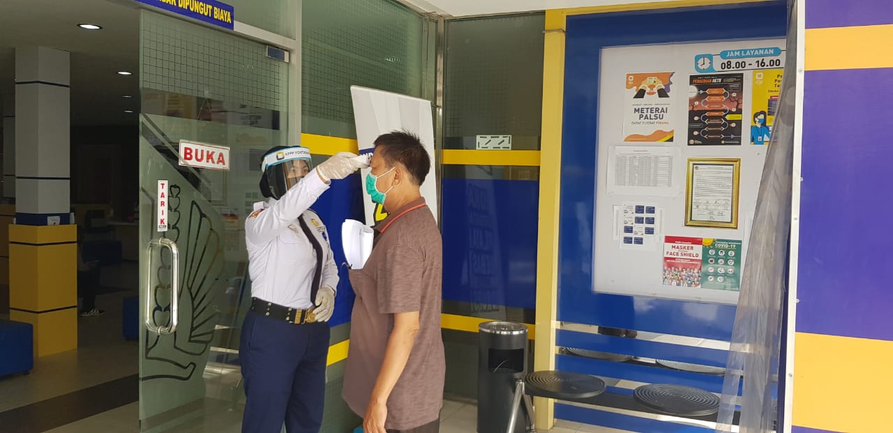 KPP Pratama Pontianak Barat kembali membuka layanan tatap muka dengan memperhatikan protokol kesehatan di Tempat Pelayanan Terpadu (TPT) kantor, di Kota Pontianak (Senin, 15/06). Wajib pajak yang datang wajib memakai masker, dan mencuci tangan di tempat yang telah di tentukan. Sebelum masuk ke ruangan TPT, petugas akan mengukur suhu tubuh wajib pajak.