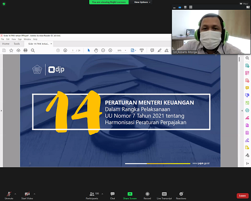 Tim Penyuluh Kantor Wilayah Direktorat Jenderal Pajak (Kanwil DJP) Jakarta Utara menjadi pemateri seminar di Institut Bisnis dan Informatika Kwik Kian Gie (IBI KKG) yang dilaksanakan daring melalui Zoom di Jakarta (Kamis, 14/4).