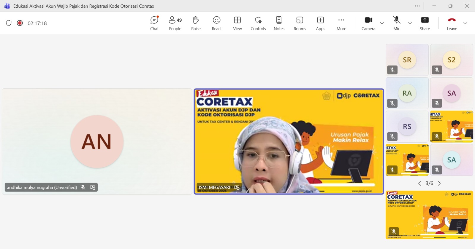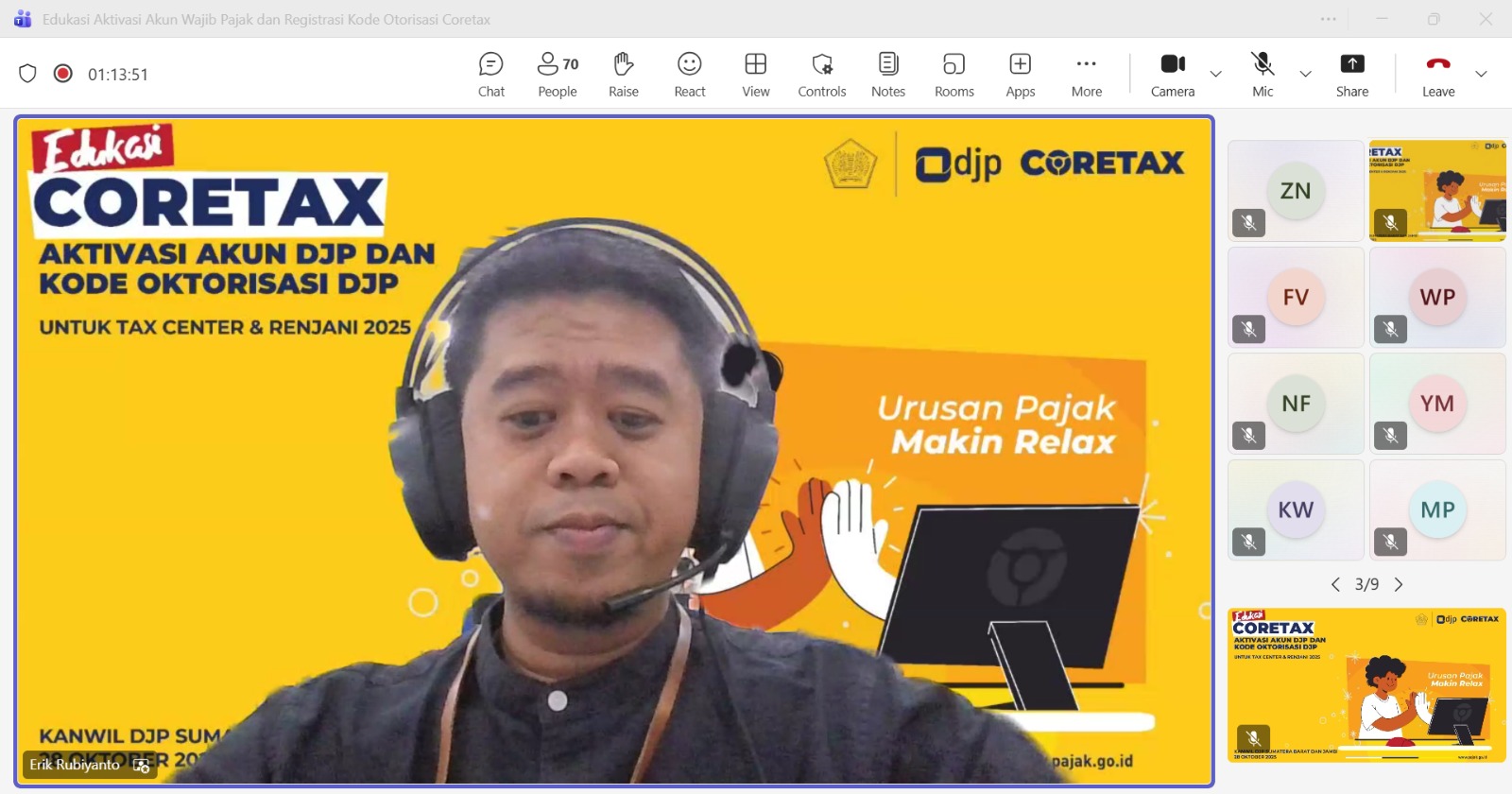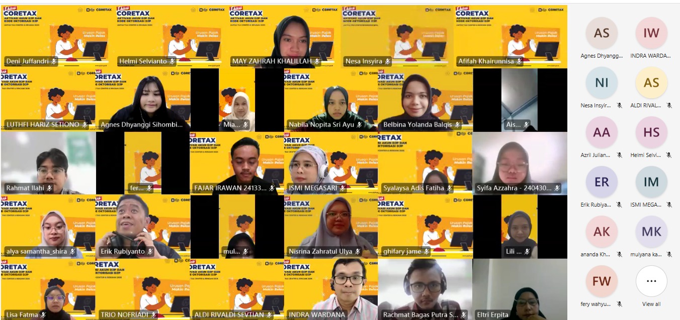 Kanwil DJP Sumatera Barat dan Jambi mengajak perguruan tinggi di Wilayah Sumatera Barat dan Jambi melalui Tax Center untuk berpartisipasi dalam menggaungkan aktivasi akun Coretax DJP secara daring melalui Microsoft Teams (Selasa, 28/10). Selain itu, Kanwil DJP juga menggandeng Relawan Pajak untuk Negeri (Renjani) guna mendukung kegiatan tersebut.