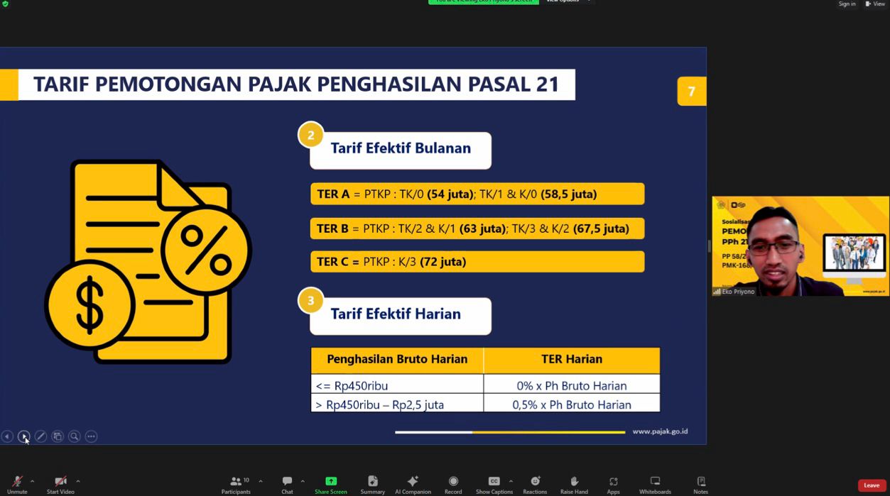 Kelas pajak kali ini mengusung tema Sosialisasi Peraturan Perpajakan Terbaru tentang Pajak Penghasilan (PPh) Pasal 21. Kegiatan dimulai pada pukul 14.00 WIB sampai dengan pukul 16.00 WIB. Tim Penyuluh Pajak KPP Pratama Jakarta Pulogadung Eko Priyono dan Dede Saptian, memberikan edukasi dasar perpajakan terkait hak dan kewajiban wajib pajak. Selanjutnya, peserta kelas pajak diberikan sosialisasi terkait pengaturan perpajakan terbaru Pajak Penghasilan (PPh) Pasal 21.
