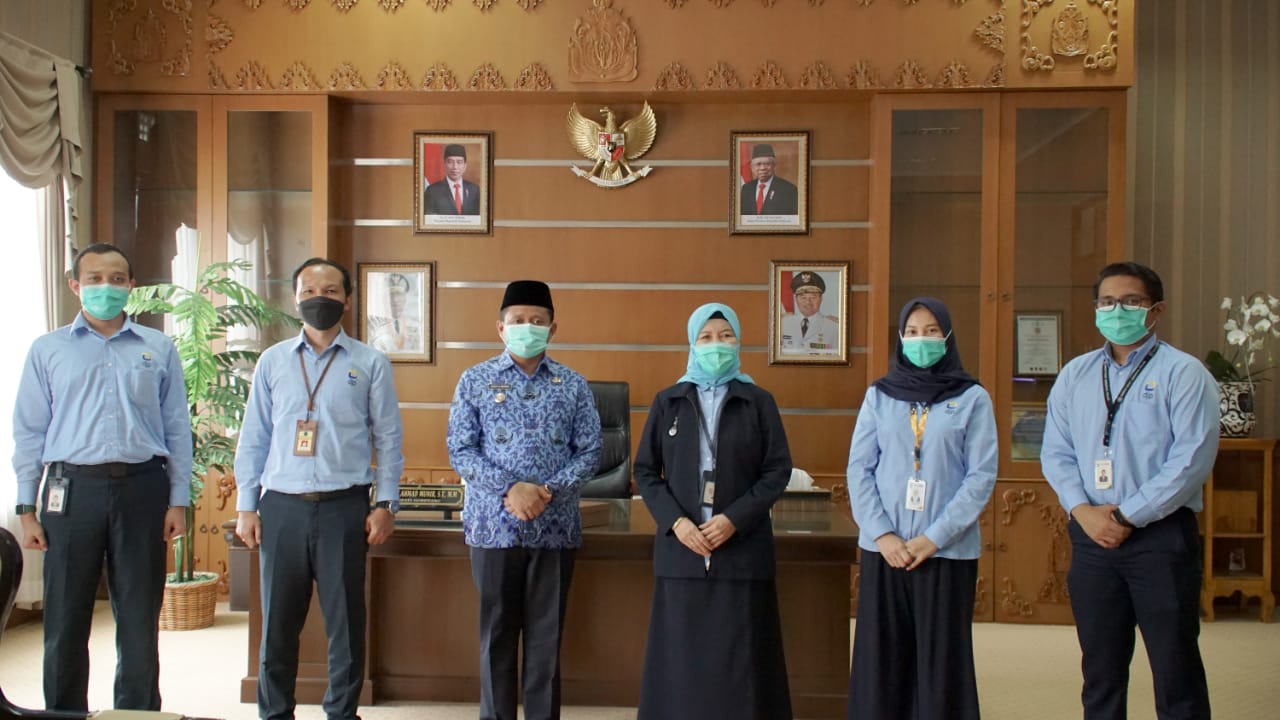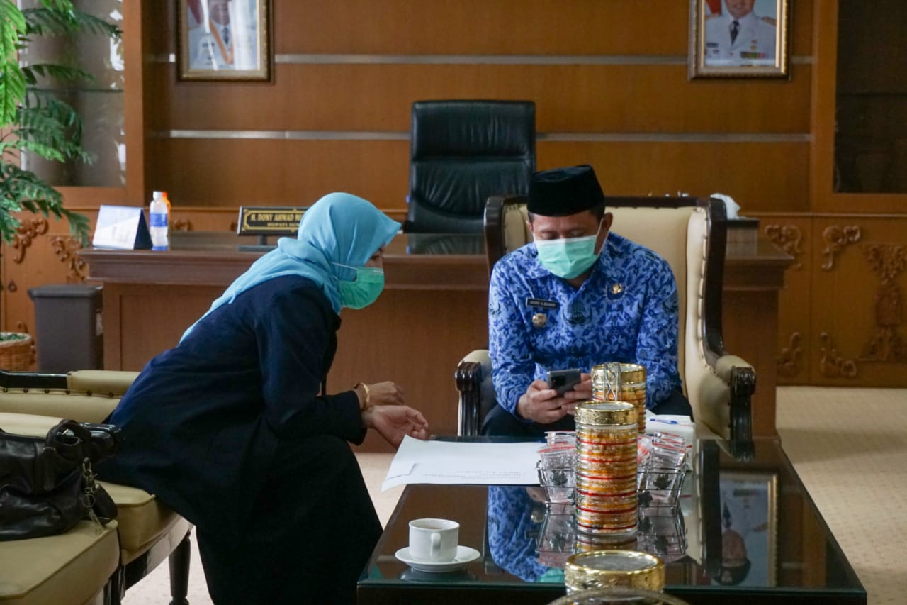 Kepala Kantor Pelayanan Pajak (KPP) Pratama Sumedang Roos I. Yulinapatrianingsih mendampingi Bupati Sumedang Dony Ahmad Munir menyampaikan SPT Tahunan melalui e-Filing di Gedung Induk Pusat Pemerintahan (IPP) Sumedang, Jalan Prabu Gajah Agung, Situ, Kecamatan Sumedang Utara, Kabupaten Sumedang, Jawa Barat (Rabu, 17/3).