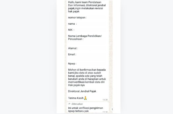 Irfan, Perwakilan Kelompok Konstruksi, menyampaikan bahwa ia menerima pesan ancaman dari oknum penipu yang mengatasnamakan Direktorat Jenderal Pajak (DJP).