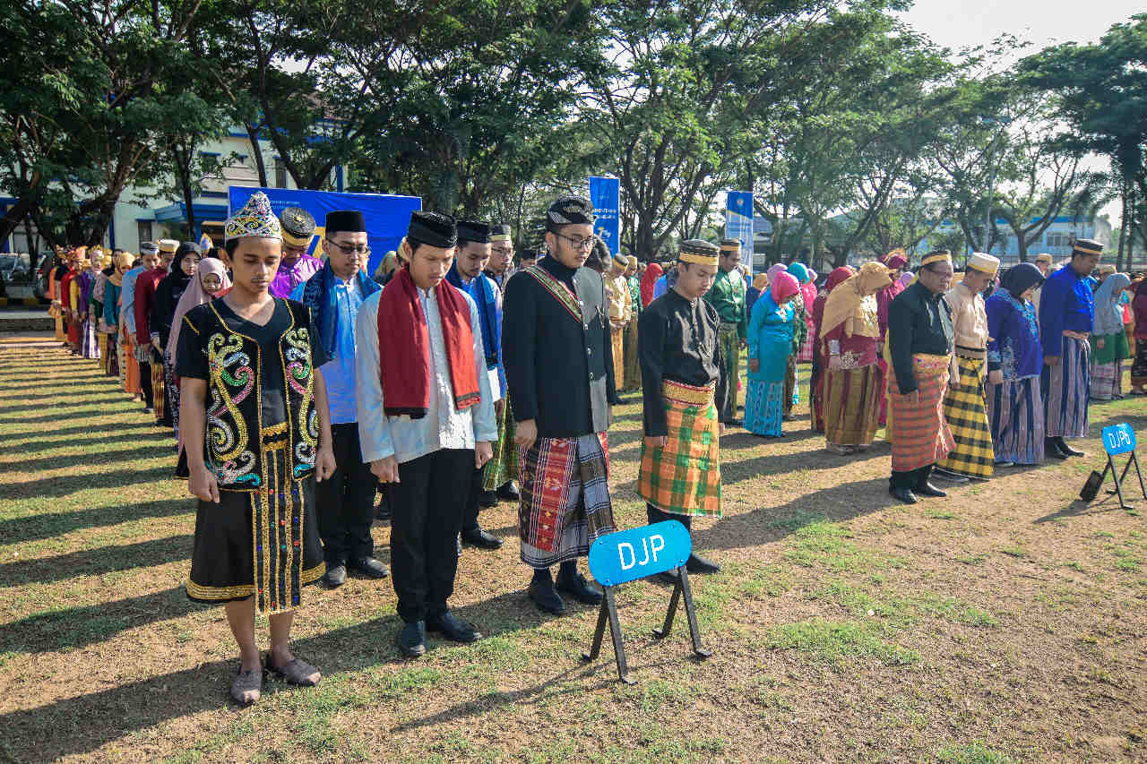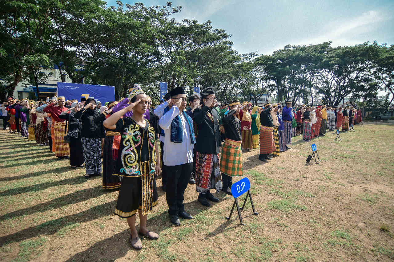 Peserta upacara mengenakan pakaian adat dari seluruh wilayah Indonesia yang menggambarkan semboyan bangsa Indonesia Bhinneka Tunggal Ika yaitu "Berbeda-beda tetapi tetap satu". Terlihat warna-warni pakaian adat yang merupakan bentuk cinta pada warisan budaya turut menyemarakkan upacara hari ini.