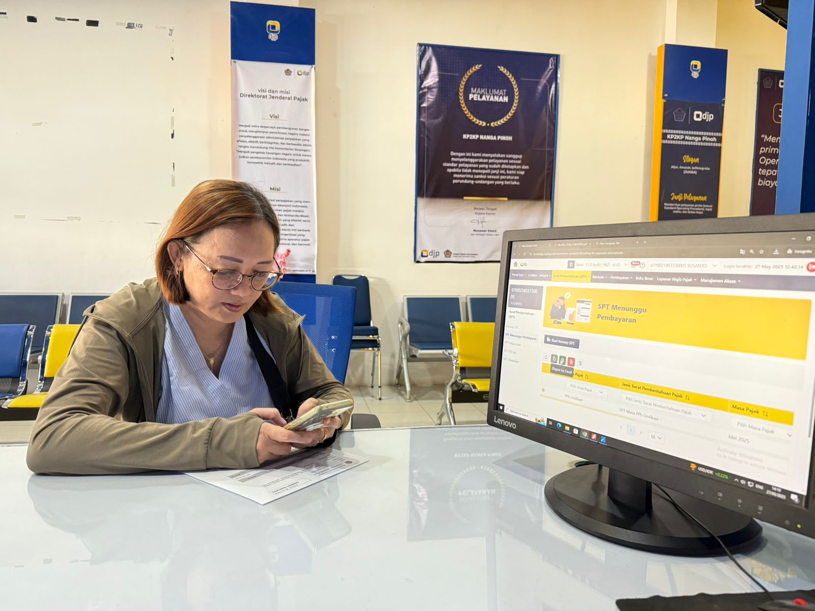 Wajib pajak melakukan konsultasi terkait pembuatan bukti potong elektronik (e-Bupot) Unifikasi bersama dengan Petugas Penyuluh Kantor Pelayanan, Penyuluhan, dan Konsultasi Perpajakan (KP2KP) Nanga Pinoh di Ruang Tempat Pelayanan Terpadu (TPT) KP2KP Nanga Pinoh, Kabupaten Melawi (Selasa, 27/5).