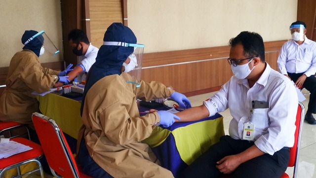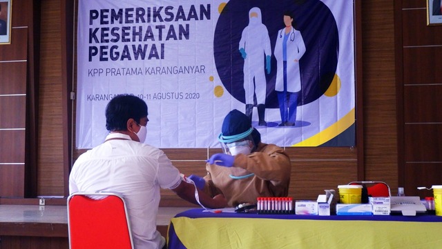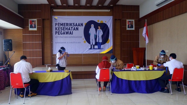Dalam rangka pencegahan penyebaran virus Covid-19, KPP Pratama Karanganyar bekerja sama dengan Prodia melakukan tes cepat atau rapid test kepada seluruh pegawai bertempat di KPP Pratama Karanganyar (Senin, 10/8). Pelaksanaan tes cepat ini dibagi menjadi dua gelombang, yakni Senin dan Selasa, 10 dan 11 Agustus 2020 dengan tetap memperhatikan protokol kesehatan.