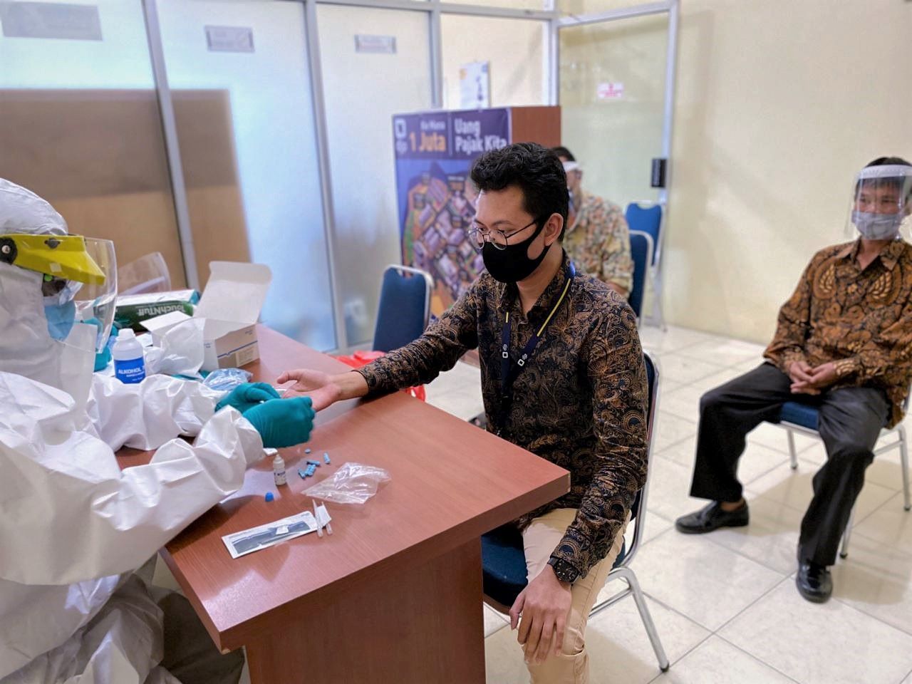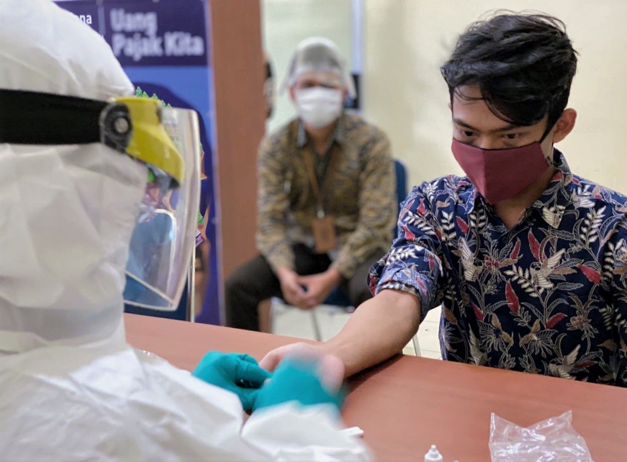 Sebagai upaya deteksi dini dan mengantisipasi persebaran pandemi Covid-19, Kantor Penyuluhan, Pelayanan, dan Konsultasi Perpajakan (KP2KP) Lasusua menggelar kegiatan rapid test dengan mengambil sampel darah yang diikuti oleh seluruh pegawai bertempat di ruang aula KP2KP Lasusua, Kabupaten Kolaka Utara (Selasa, 11/8).