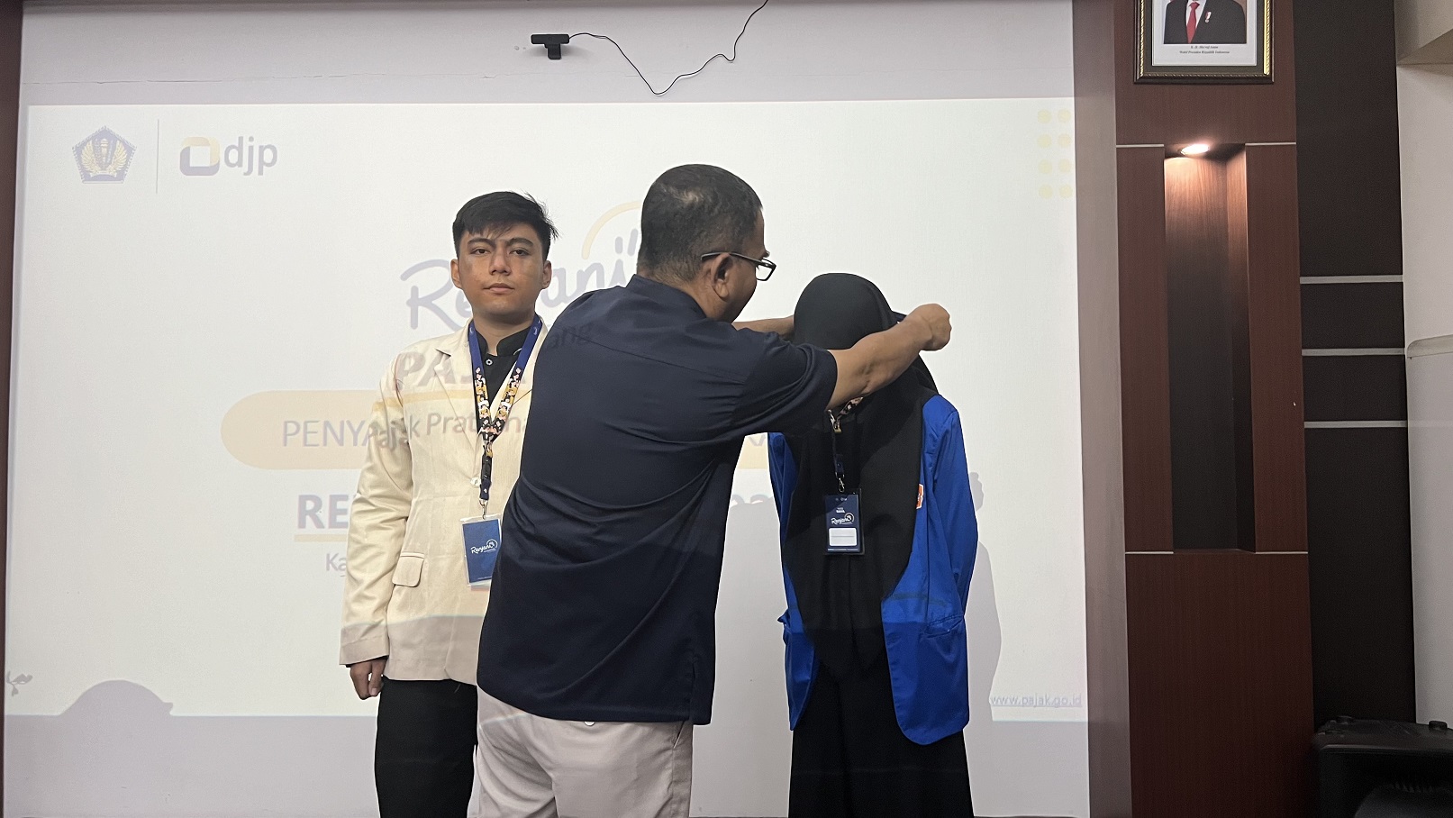 Hanis Purwanto selaku Kepala KPP Pratama Bontang secara simbolis mengalungkan tanda pengenal kepada kedua perwakilan mahasiswa dan mahasiswi dari Sekolah Tinggi Teknologi Bontang dan Sekolah Tinggi Ilmu Tarbiyah Syamsul Ma'arif Bontang.