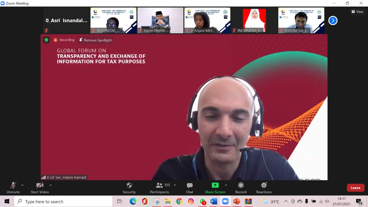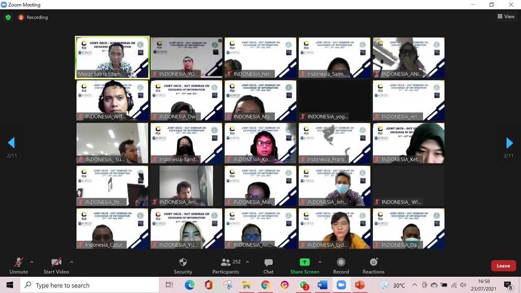 Direktorat Jenderal Pajak (DJP) bersama Organisasi Ekonomi Internasional OECD (Organisation for Economic Co-operation and Development) menyelenggarakan seminar bertajuk “Joint OECD-DGT Seminar on Exchange of Information 2021” melalui media telekonferensi yang dipandu dari gedung Kantor Pusat DJP, di Jakarta (Rabu, 21/7).