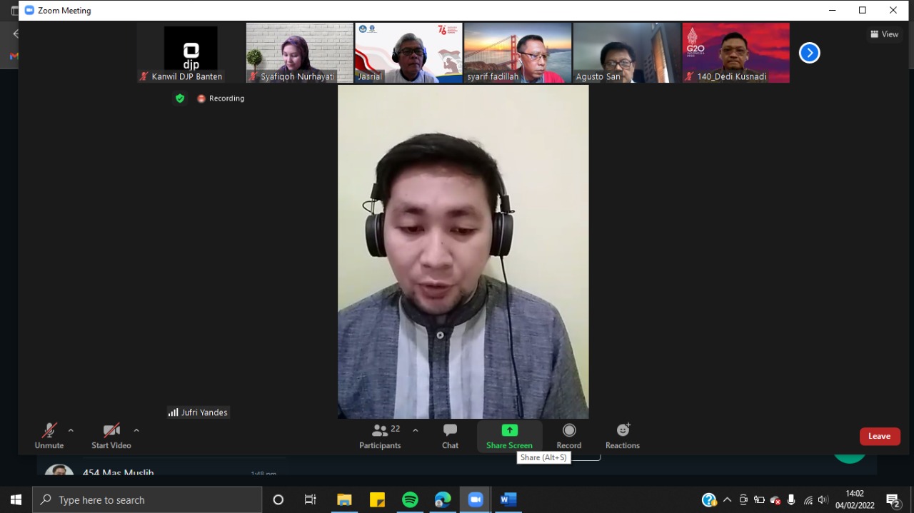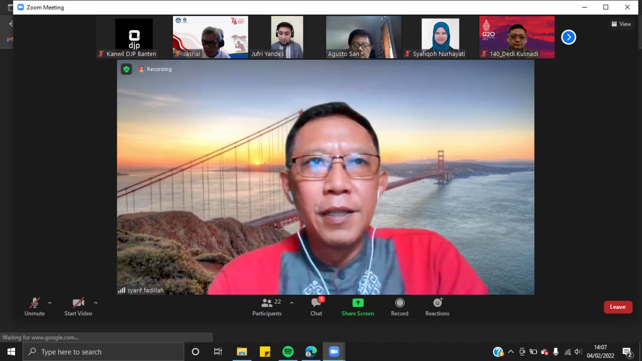Kantor Wilayah DJP Banten bersama Tax Center Universitas Terbuka melakukan kegiatan pembekalan kepada relawan pajak secara daring melalui aplikasi zoom cloud meeting di Kota Serang, Banten (Jumat, 4/2). Kegiatan ini bertujuan untuk memberikan pembekalan kepada para relawan pajak sebelum terjun langsung melayani wajib pajak di Provinsi Banten, khususnya di Kota Tangerang Selatan.