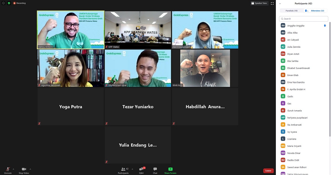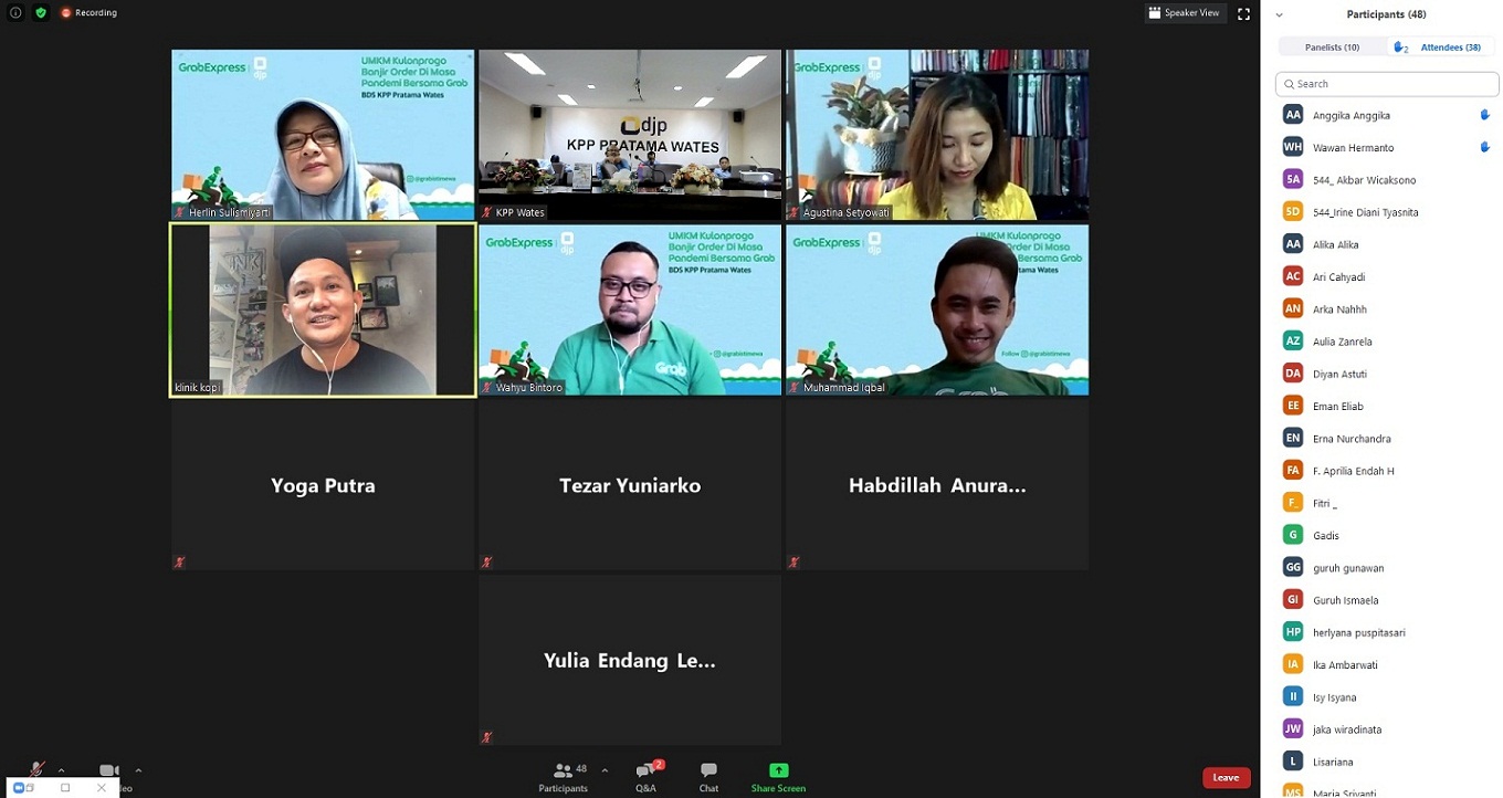 Diretorat Jenderal Pajak (DJP) melalui Kantor Pelayanan Pajak (KPP) Pratama Wates kerja sama dengan Grab Indonesia menggelar Webinar Business Development Services dengan tema "UMKM Kulon Progo Banjir Order di Masa Pandemi" dengan menggunakan media Zoom Meeting, di Yogyakarta (Rabu, 30/9).