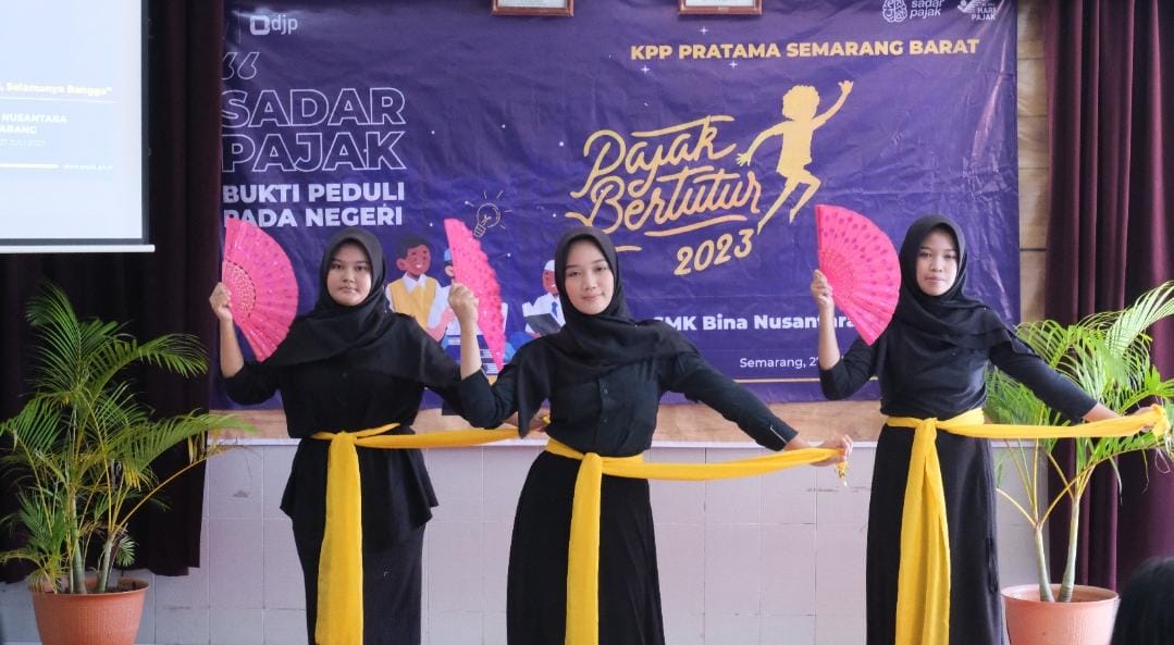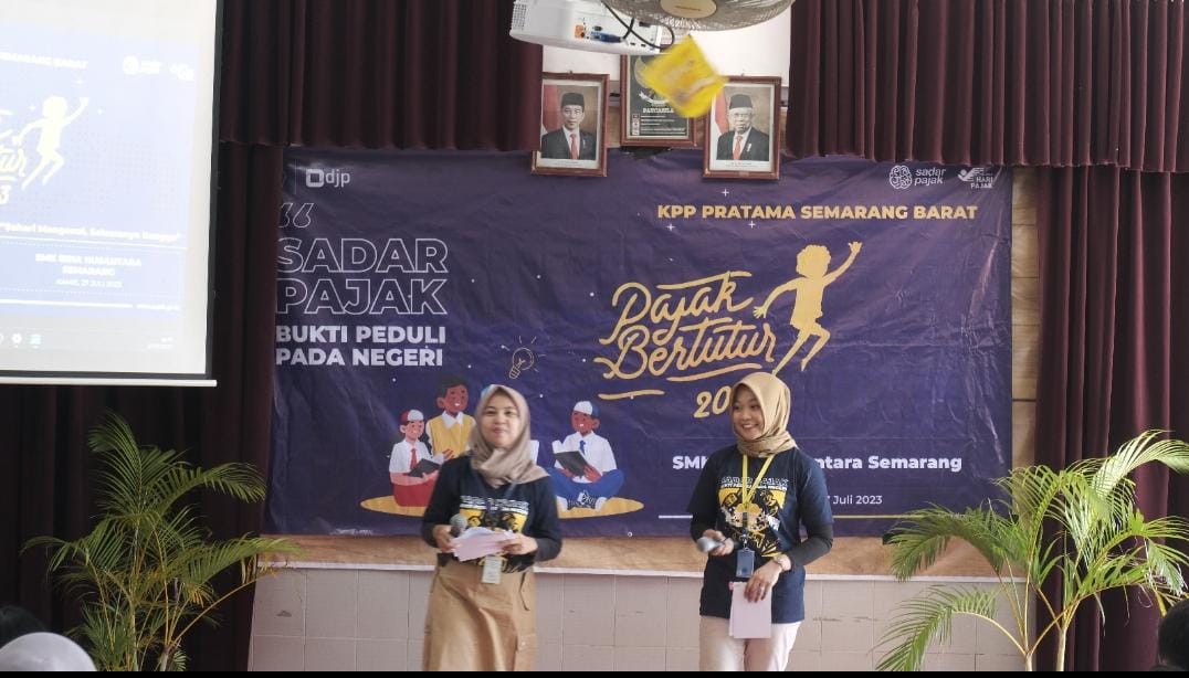 Kantor Pelayanan Pajak (KPP) Pratama Semarang Barat menyelenggarakan kegiatan Pajak Bertutur di Aula Sekolah Menengah Kejuruan (SMK) Bina Nusantara, Mangkang, Semarang Barat, Semarang (Kamis, 27/7). Kegiatan yang mengusung tema “Sadar Pajak, Bukti Peduli Pada Negeri” ini diikuti oleh 31 siswa SMK Bina Nusantara.