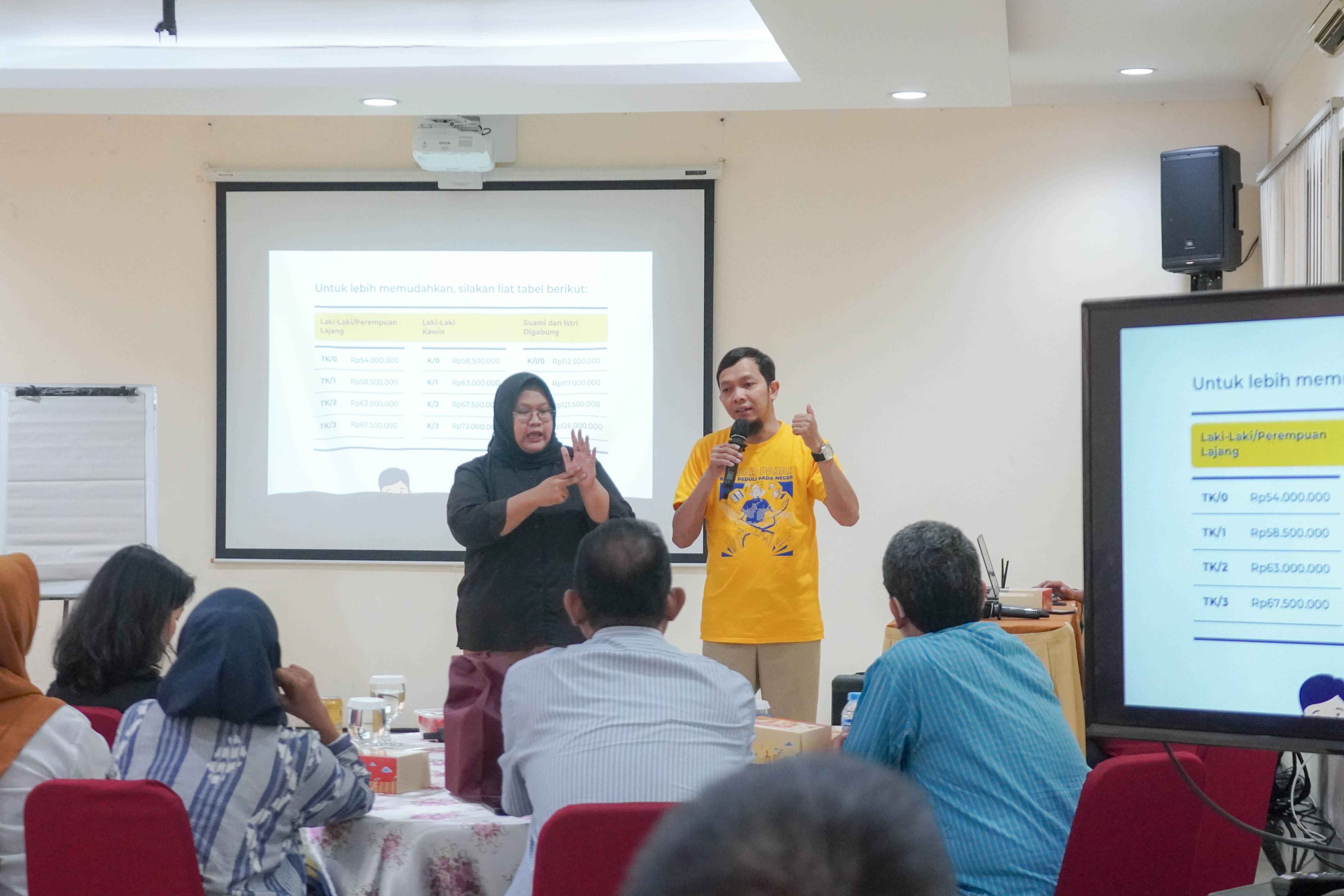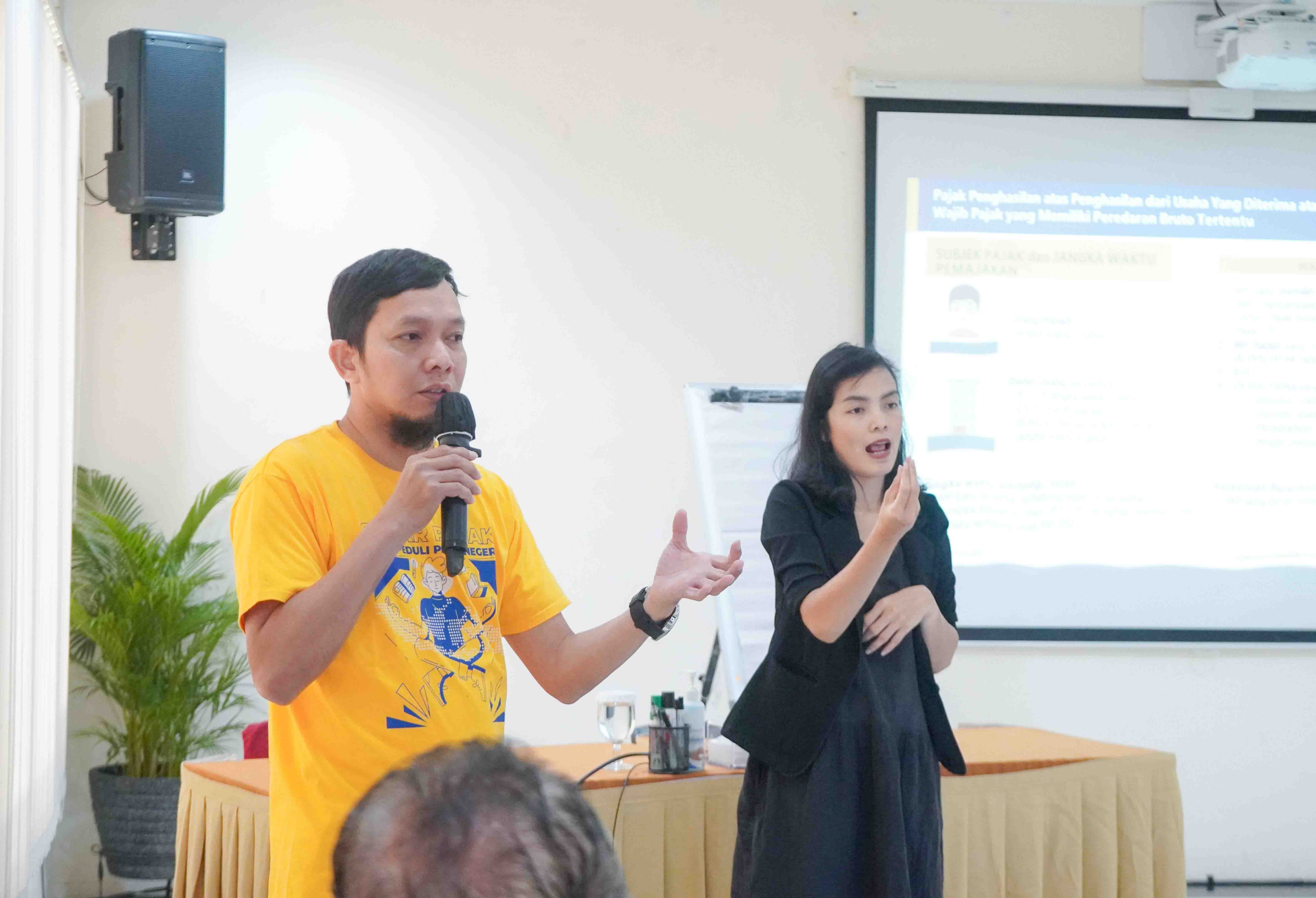 Tim Fungsional Penyuluh Pajak Kanwil DJP Jakarta Selatan I bersama dengan Juru Bahasa Isyarat menyampaikan materi terkait ketentuan perpajakan secara umum kepada puluhan teman-teman tuli yang hadir.