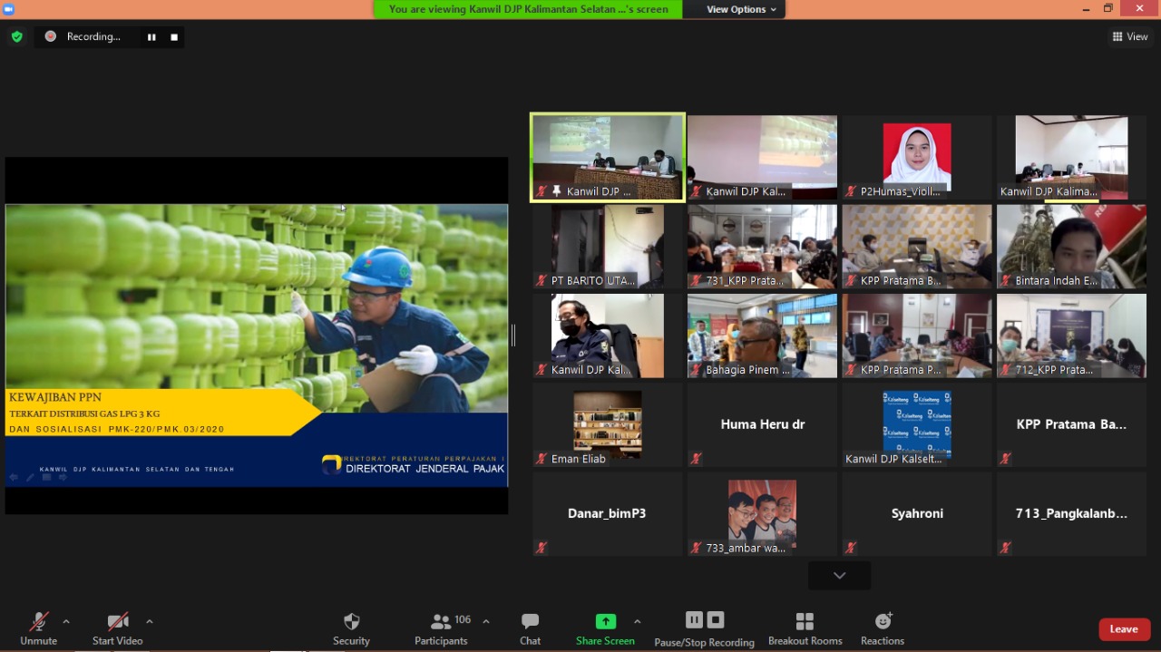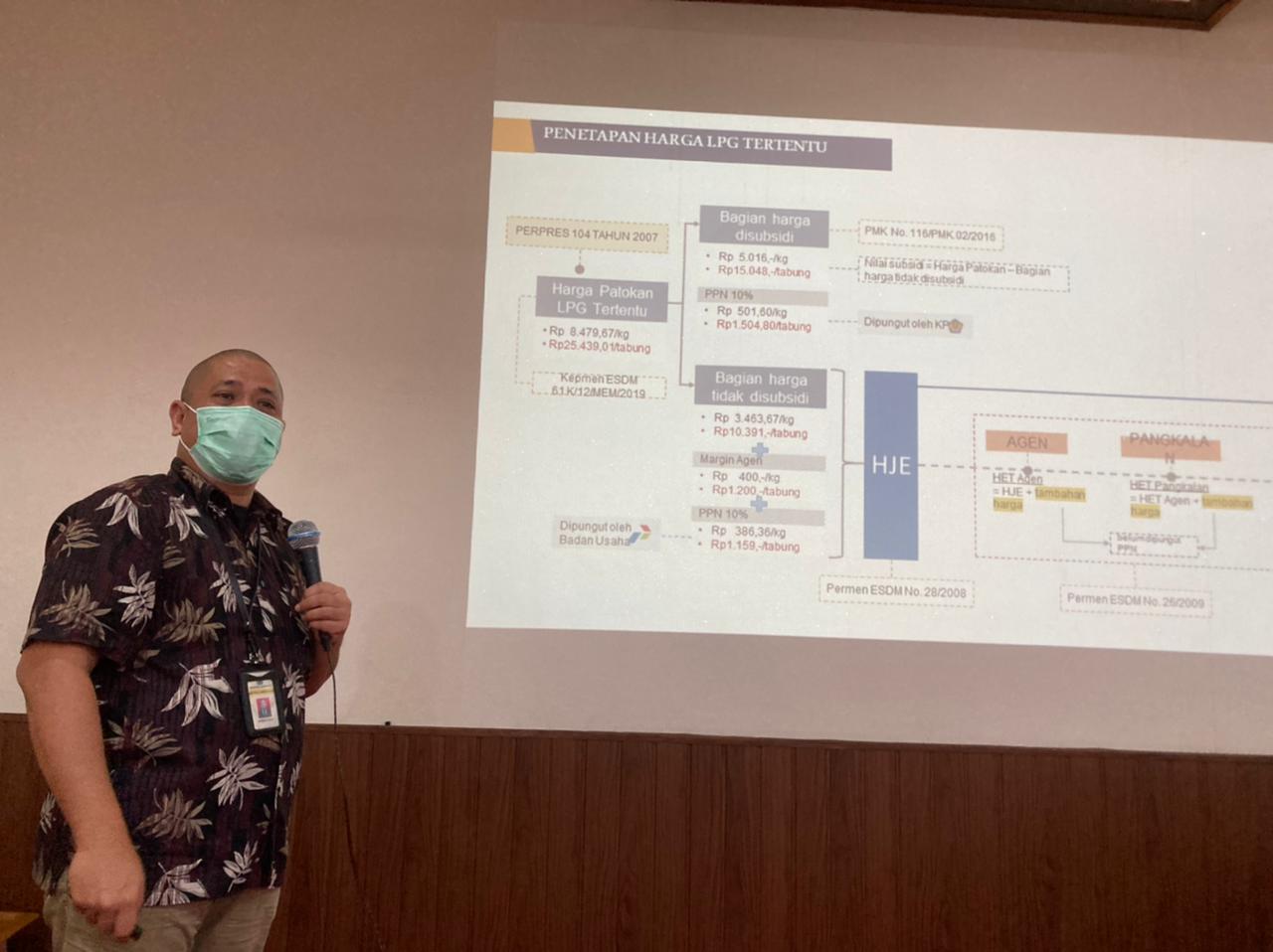 Narasumber menyampaikan materi mengenai PMK 220/PMK.03/2020 tentang Tata Cara Penghitungan dan Pemungutan Pajak Pertambahan Nilai atas Penyerahan Liquefied Petroleum Gas (LPG) Tertentu. Informasi yang disampaikan seputar latar belakang peraturan PMK 220/PMK.03/2020, aspek perpajakan, serta tata cara penghitungan dan pemungutan LPG tertentu.