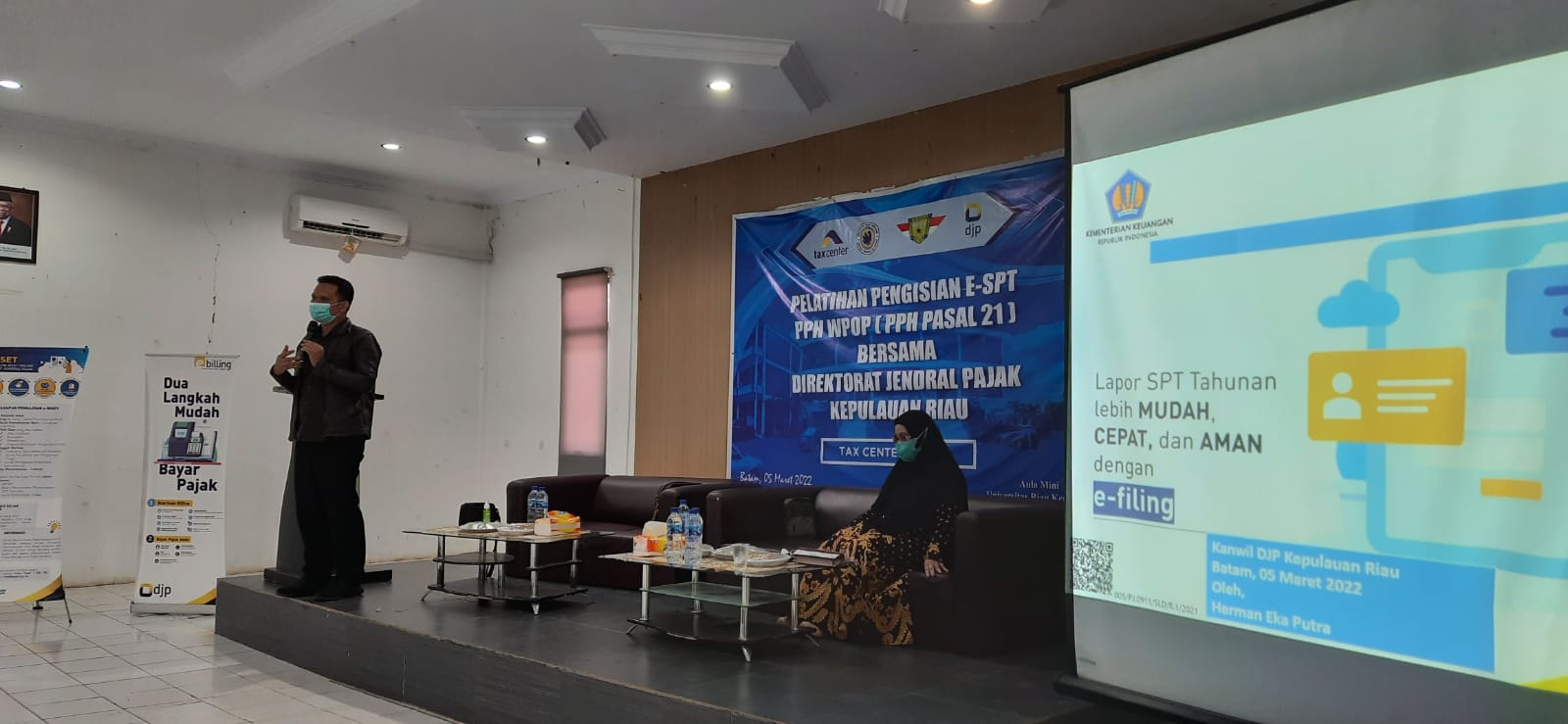 Kantor Wilayah Direktorat Jenderal Pajak Kepulauan Riau (Kanwil DJP Kepri) menjadi narasumber pada kegiatan pelatihan pengisian Surat Pemberitahuan (SPT) Tahunan melalui e-Filing yang diselenggarakan oleh Tax Center Universitas Riau Kepulauan (Unrika) di Aula Mini Unrika, Kota Batam (Sabtu, 5/3). Acara ini merupakan bagian dari persiapan bagi relawan pajak pada Tax Center Unrika yang dihadiri oleh para dosen dan mahasiswa.