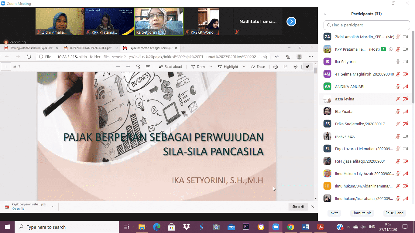 KPP Pratama Temanggung menyelenggarakan sit in inklusi kesadaran pajak bagi mahasiswa UNSIQ Wonosobo di ruang edukasi KPP Pratama Temanggung secara daring melalui zoom meeting (Jumat, 27/11).