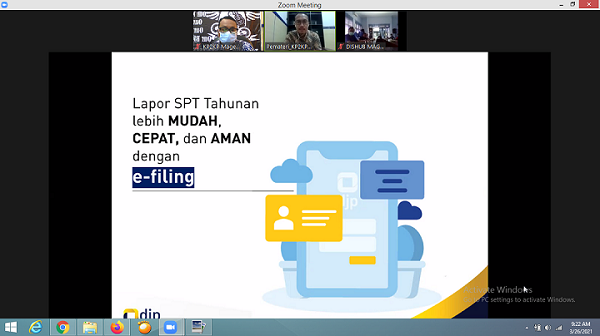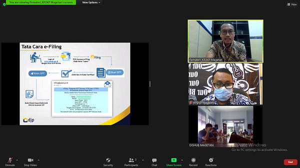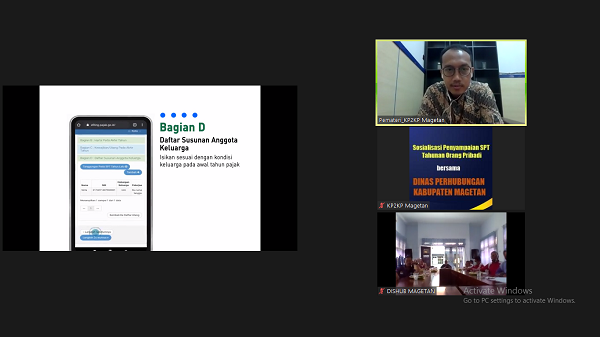 Kantor Pelayanan, Penyuluhan, dan Konsultasi Perpajakan (KP2KP) Magetan mengadakan sosialisasi secara daring (online) tentang Tata Cara Pengisian SPT Tahunan Orang Pribadi 1770 S dan 1770 SS melalui e-Filing melalui aplikasi Zoom Meeting di Magetan (Jumat, 26/3). Kegiatan tersebut diikuti oleh dua belas pegawai Dinas Perhubungan (Dishub) Kabupaten Magetan.