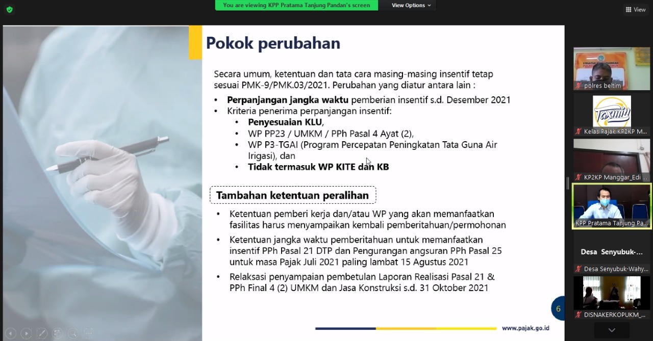 Kantor Pelayanan, Penyuluhan, dan Konsultasi Perpajakan (KP2KP) Manggar dan Tim Fungsional Penyuluh Kantor Pelayanan Pajak (KPP) Pratama Tanjung Pandan melakukan sosialisasi kebijakan perpanjangan insentif pajak kepada instansi pemerintah dan diikuti oleh 45 peserta, kegiatan diselenggarakan secara daring melalui Aplikasi Zoom Meeting di KP2KP Manggar, Kabupaten Belitung Timur (Rabu, 4/8).