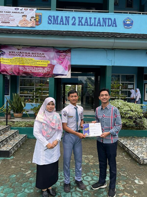 Kantor Pelayanan, Penyuluhan, dan Konsultasi Perpajakan (KP2KP) Kalianda melaksanakan kunjungan kerja ke Sekolah Menengah Atas Negeri (SMAN) 2 Kalianda, Jalan Trans Sumatera Desa Kedaton, Kalianda, Kabupaten Lampung Selatan, Provinsi Lampung (Kamis, 3/8). Kunjungan tersebut dilaksanakan dalam rangka penyerahan sertifikat peserta acara Pajak Bertutur 2023 yang telah berhasil dilaksanakan sebelumnya.