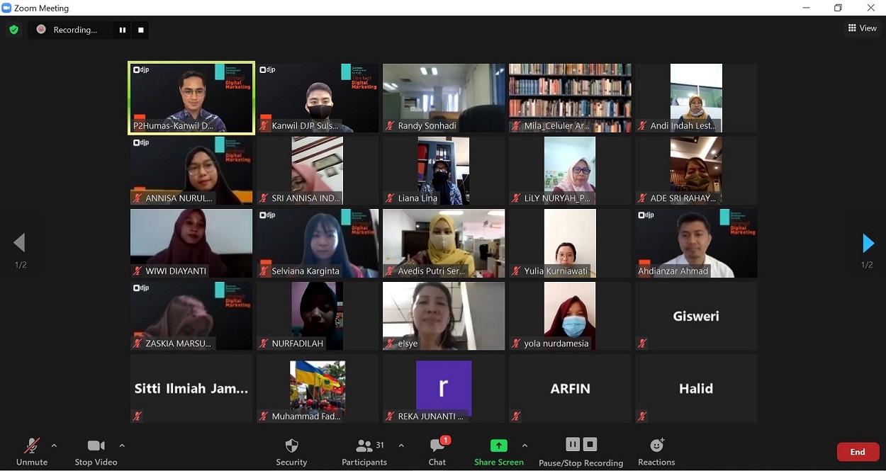 Kanwil DJP Sulawesi Selatan, Barat, dan Tenggara (Sulselbartra) melangsungkan acara Business Development Services secara daring di Kota Makassar (Selasa, 17/11). Sejumlah 44 peserta yang terdiri dari wajib pajak pelaku UMKM mengikuti acara yang mengambil tema utama Strategi Digital Marketing ini.
