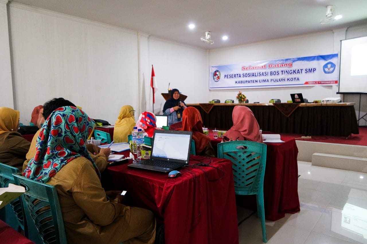 Kegiatan Sosialisasi Bendahara Sekolah Menengah Pertama (SMP) yang diadakan di Aula Hotel Sago Bungsu I, Jalan Raya Tanjung Pati KM7, Kecamatan Harau (10/9). Sosialisasi ini merupakan bentuk kerjasama dengan Dinas Pendidikan dan Kebudayaan Kab. Lima Puluh Kota dalam pengelolaan Dana BOS SMP se-Kecamatan Harau. Peserta sosialisasi sendiri merupakan Bendahara di SMP se-Kecamatan Harau, para peserta yang hadir terlihat aktif dan responsif dalam mengikuti kegiatan sosialisasi.