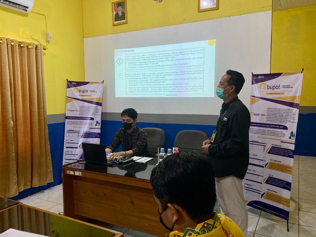 Kegiatan ini dilakukan untuk menjelaskan cara mengakses aplikasi e-Bupot Instansi Pemerintah disertai dengan tata cara pengisian sampai dengan pelaporan Surat Pemberitahuan (SPT) Masa. Di samping itu, tim menyampaikan peraturan perpajakan terbaru yaitu Peraturan Menteri Keuangan (PMK) Nomor 58 dan 59 Tahun 2022 yang bersentuhan langsung dengan tupoksi para bendahara serta perubahan tarif Pajak Pertambahan Nilai (PPN) dan tarif Pajak Penghasilan (PPh) Jasa Konstruksi.