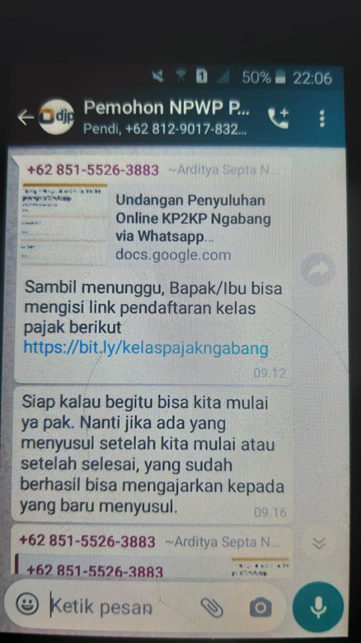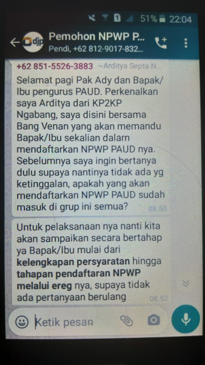 Kantor Pelayanan, Penyuluhan, dan Konsultasi Perpajakan (KP2KP) Ngabang mengadakan kelas pajak secara daring (Jumat. 24/4). Kegiatan kelas pajak ini bertujuan mengedukasi wajib pajak dalam pembuatan NPWP PAUD. Kegiatan ini dipandu oleh Tenaga Penyuluh KP2KP Ngabang Venansius Fajar Sinabutar dan Arditya Septa Nugraha.