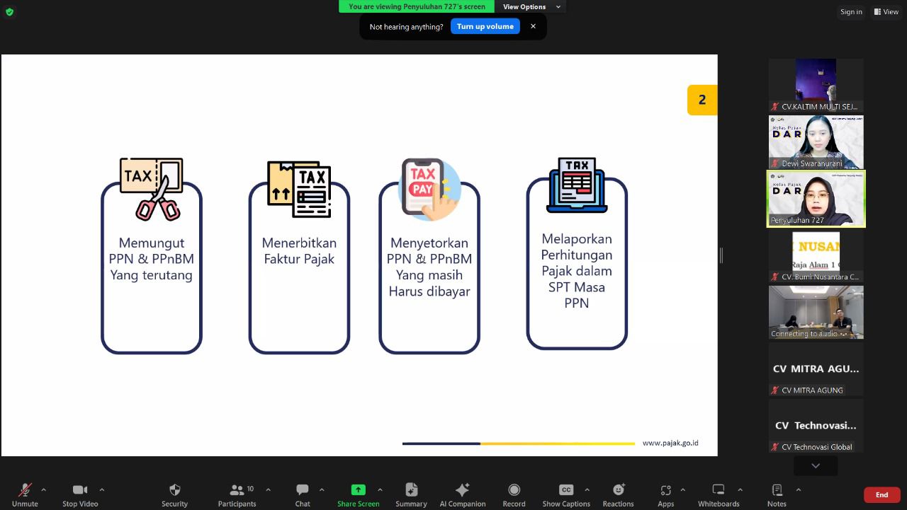 “Beberapa syarat agar Pengusaha Kena Pajak (PKP) dapat membuat e-faktur adalah wajib pajak harus memiliki sertifikat elektronik, akun PKP yang telah diaktivasi, dan Nomor Seri Faktur Pajak (NSFP) yang diberikan oleh Direktorat Jenderal Pajak (DJP),” ungkap Asisten Penyuluh Pajak Kantor Pelayanan Pajak (KPP) Pratama Tanjung Redeb Luthfyana Herindawati saat menjadi pemateri kelas pajak hak dan kewajiban perpajakan PKP secara daring melalui aplikasi Zoom Meeting di KPP Pratama Tanjung Redeb, Jalan Jenderal Sudirman No 104, Pamusian, Tarakan Tengah, Kota Tarakan, Kalimantan Utara (Kamis, 2/5).