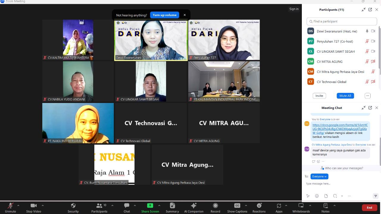 Acara kelas pajak ini dihadiri oleh 10 wajib pajak KPP Pratama Tanjung Redeb. Sebelumnya, tim KPP Pratama Tanjung Redeb telah mengirim WhatApp Blast kepada ratusan wajib pajak PKP dilingkungan KPP Pratama Tanjung Redeb untuk mengikuti kelas pajak ini.