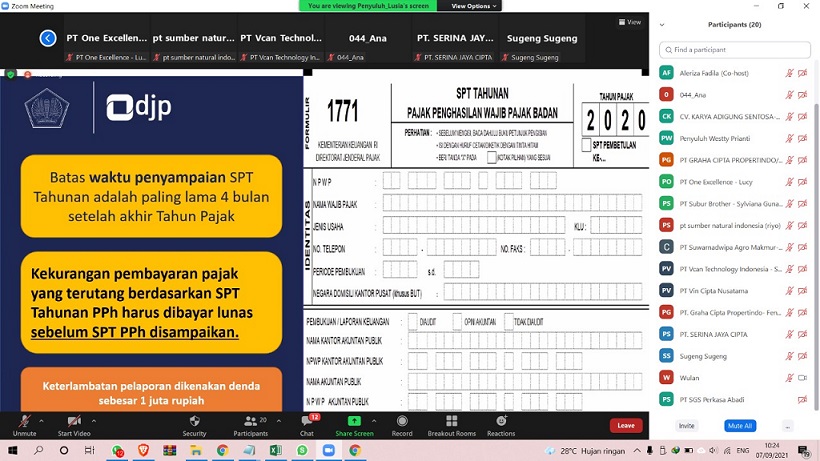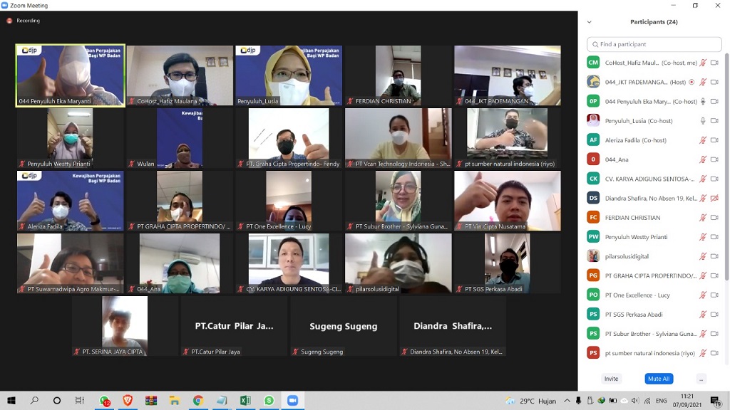 Kegiatan diselenggarakan melalui kanal Zoom Meeting. Materi kelas pajak disampaikan Tim Penyuluh Pajak KPP Pratama Jakarta Pademangan. Kelas pajak dihadiri oleh 20 Direktur dan Penanggung Jawab Wajib Pajak Badan.