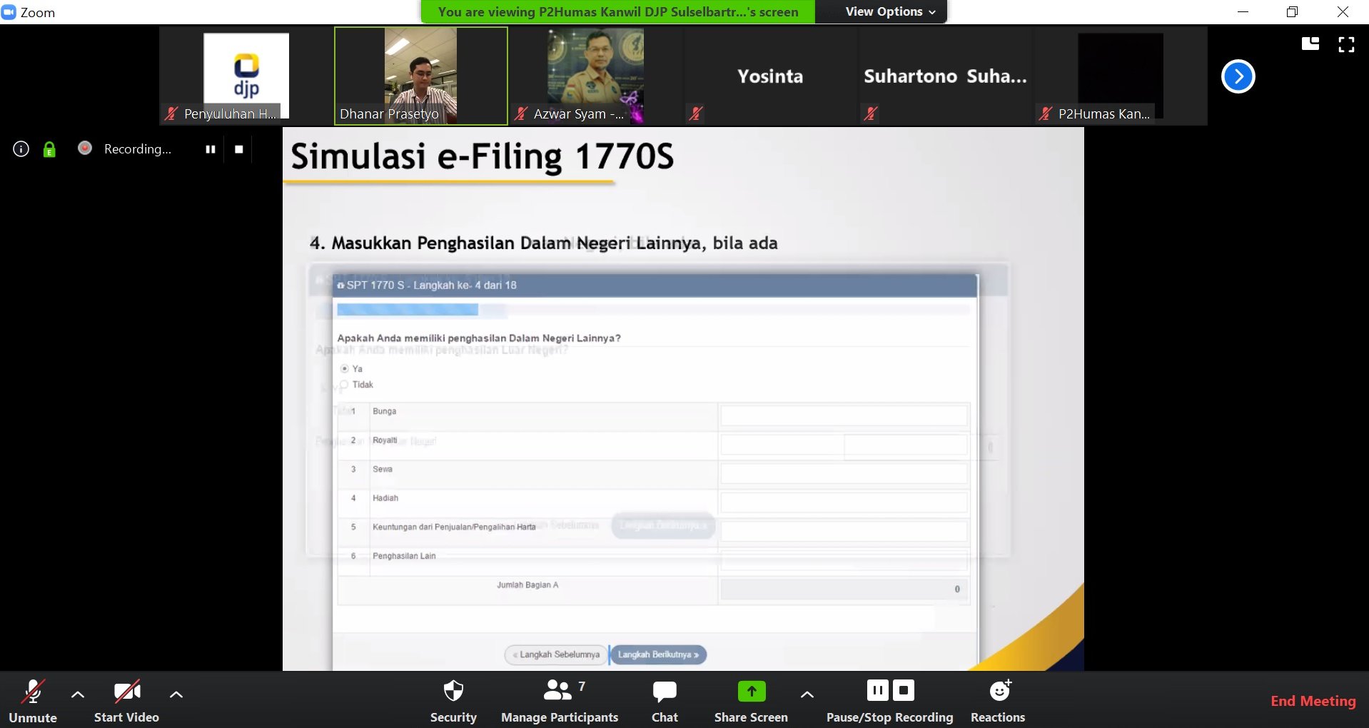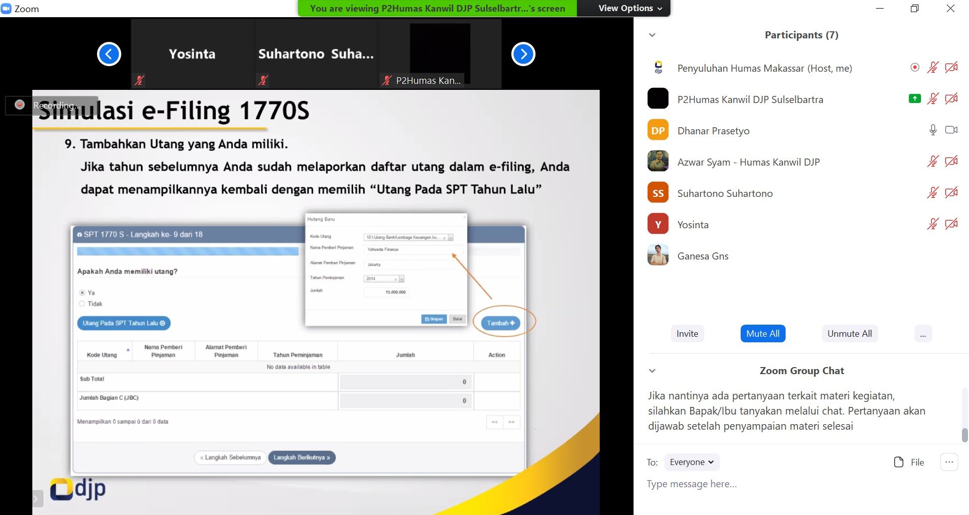 Kanwil DJP Sulawesi Selatan, Barat, dan Tenggara (Sulselbartra) mengadakan Sosialisasi Perpajakan yang dikemas dalam kegiatan kelas pajak daring melalui aplikasi Zoom di Makassar (Kamis, 23/4). Kegiatan yang mengambil tema 'Sosialisasi Pelaporan SPT Tahunan PPh Orang Pribadi Secara Online' ini diikuti oleh Wajib Pajak Orang Pribadi di wilayah Kota Makassar dan sekitarnya.