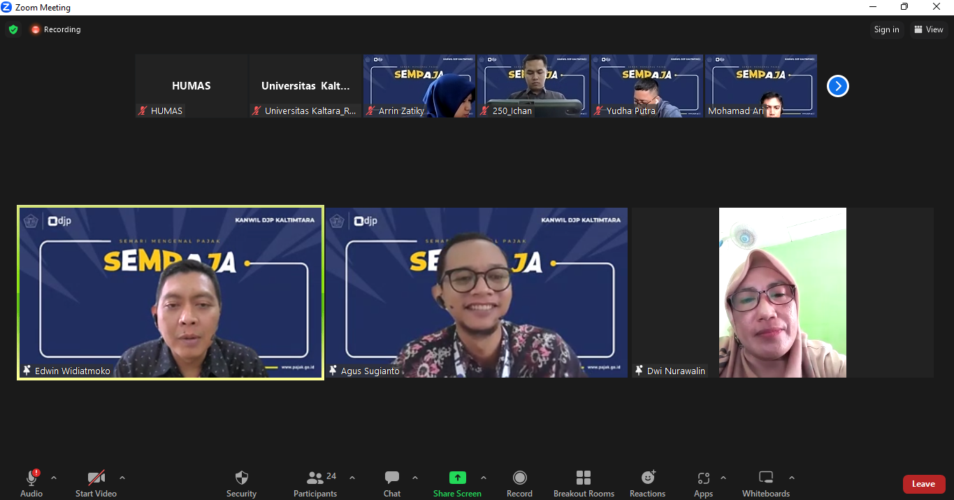 Berkolaborasi dengan Universitas Kaltara, Kantor Wilayah Direktorat Jenderal Pajak Kalimantan Timur dan Utara (Kanwil DJP Kaltimtara) menyelenggarakan Kelas Pajak Sehari Mengenal Pajak (SEMPAJA) episode #3 secara daring. Kegiatan diikuti oleh puluhan mahasiswa dan masyarakat umum di Kota Balikpapan (Selasa, 19/9).