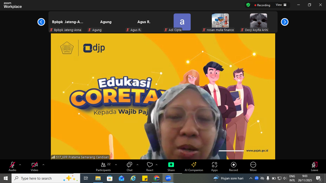 Kantor Pelayanan Pajak (KPP) Pratama Semarang Candisari gelar edukasi berupa Kelas Pajak daring melalui Zoom Meeting kepada Wajib Pajak Orang Pribadi dan Badan yang membahas tentang registrasi akun Coretax dan SPT Tahunan di era implementasi Coretax DJP (Rabu, 26/11).