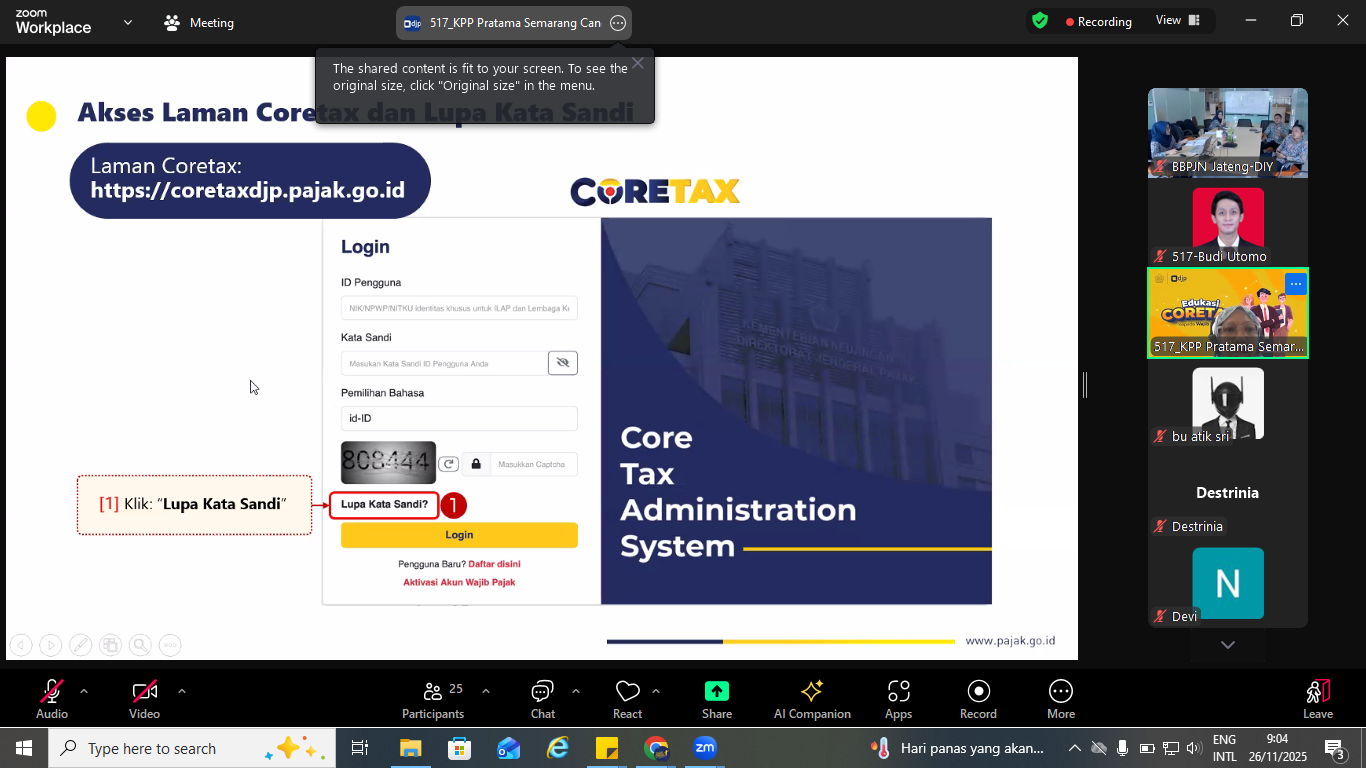 Sebanyak 40 peserta hadir secara daring melalui Zoom Meeting KPP Pratama Semarang Candisari yang diselenggarakan pukul 09.00 hingga 11.40 WIB. Kegiatan dipandu oleh Tim Penyuluh Pajak dan Yeni Setiyowati selaku pemateri Kelas Pajak Coretax.