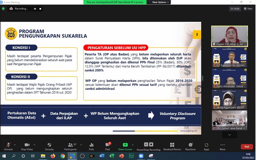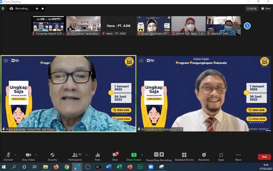 Kantor Wilayah Direktorat Jenderal Pajak (Kanwil DJP) Jawa Barat III memberikan edukasi perpajakan melalui kegiatan Kelas Pajak Program Pengungkapan Sukarela (PPS) bagi Wajib Pajak anggota Asosiasi Pengusaha Indonesia (Apindo) yang berada di Wilayah Kabupaten Bogor. Diikuti oleh 63 anggota Apindo Kabupaten Bogor, kelas pajak ini dilaksanakan secara daring di Gedung Cakti Satya Nagara, Kanwil DJP Jawa Barat III, Kota Bogor (Senin, 7/3).