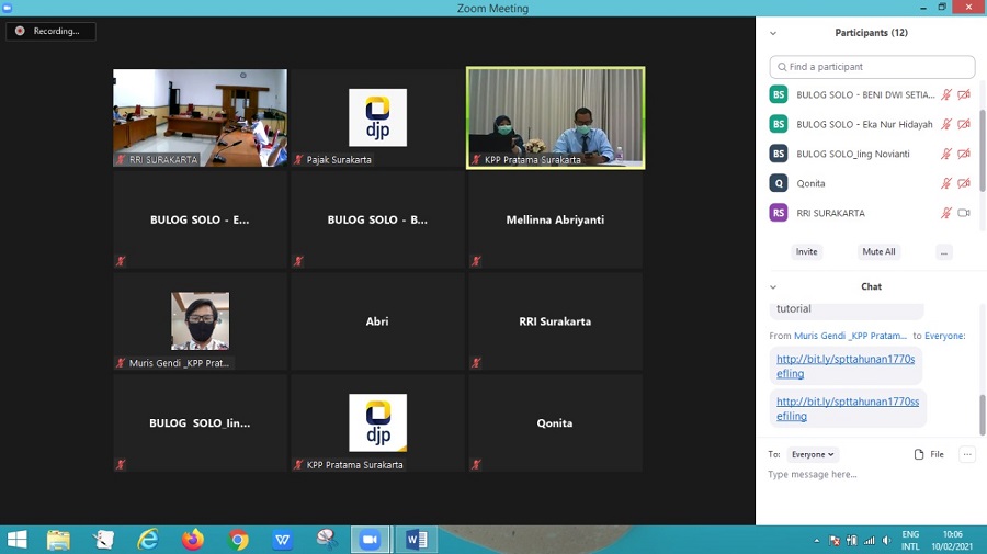 Kantor Pelayanan Pajak (KPP) Pratama Surakarta mengadakan pelatihan dan sosialisasi Pengisian SPT Tahunan Orang Pribadi Karyawan melalui Zoom Cloud Meeting dari Surakarta (Rabu, 10/2). Kegiatan yang berlangsung secara virtual ini bekerja sama dengan Badan Urusan Logistik (Bulog) Sub Divisi III Surakarta dan Radio Republik Indonesia (RRI) Surakarta.