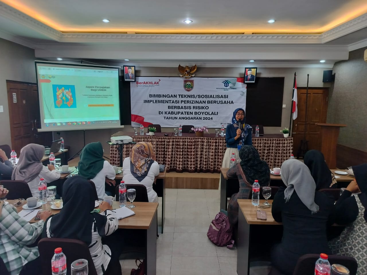 Dinas Penanaman Modal dan Pelayanan Terpadu Satu Pintu (DPMPTSP) Boyolali menyelenggarakan Bimbingan Teknis (Bimtek) Sosialisasi Implementasi Perizinan Berbasis Risiko bagi Pelaku Usaha Mikro, Kecil, dan Menengah (UMKM) di Ruang Meeting Hotel Candi Boyolali, Kecamatan Selo, Kabupaten Boyolali (Kamis, 25/7). Acara yang dihadiri oleh 40 pelaku UMKM dari seluruh Kecamatan Selo ini bertujuan untuk memberikan wawasan kepada para pelaku UMKM baru terkait pengurusan izin usaha, Nomor Induk Berusaha (NIB), dan fasilitas perpajakan yang diberikan oleh pemerintah bagi UMKM baru.
