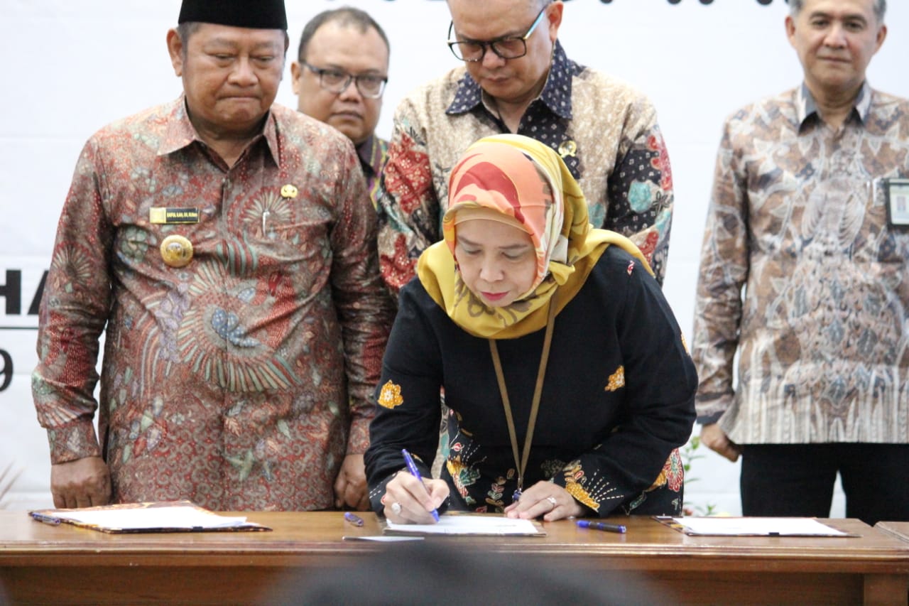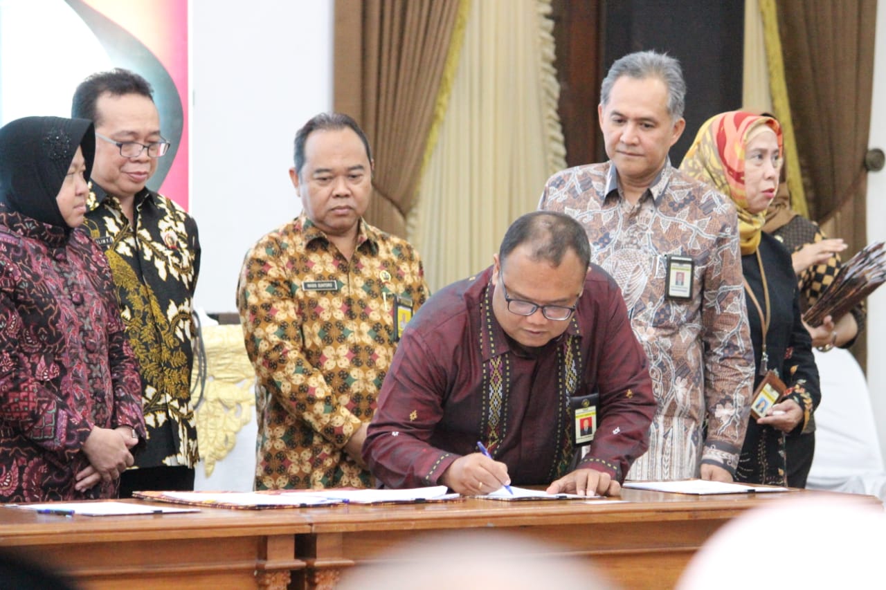 Kepala Kanwil DJP Jawa Timur I, II, dan III menandatangani Kesepakatan Bersama dengan Pemerintah Kota/Kabupaten di Provinsi Jawa Timur tentang optimalisasi penerimaan pajak pusat dan pajak daerah di Gedung Negara Grahadi Kota Surabaya selasa (24/4).