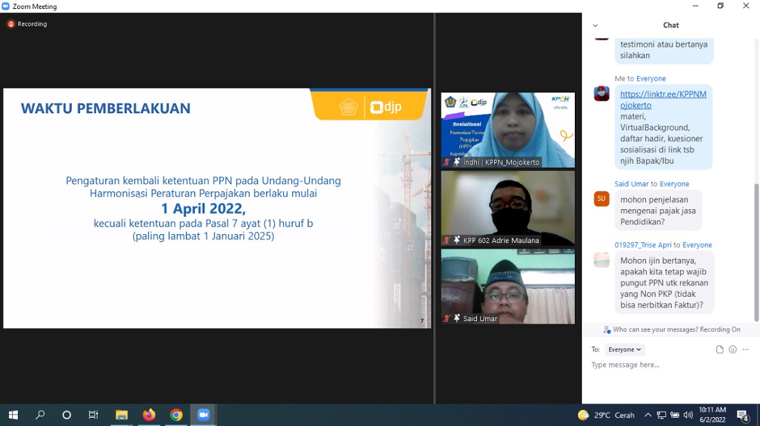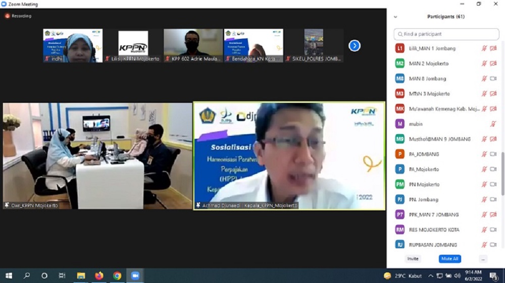 Kantor Pelayanan Pajak (KPP) Pratama Mojokerto bersama Kantor Pelayanan Perbendaharaan Negara (KPPN) Mojokerto menggelar Sosialisasi Undang-Undang Harmonisasi Peraturan Perpajakan (UU HPP) secara daring melalui aplikasi Zoom Meeting di Kota Mojokerto (Kamis, 2/6).