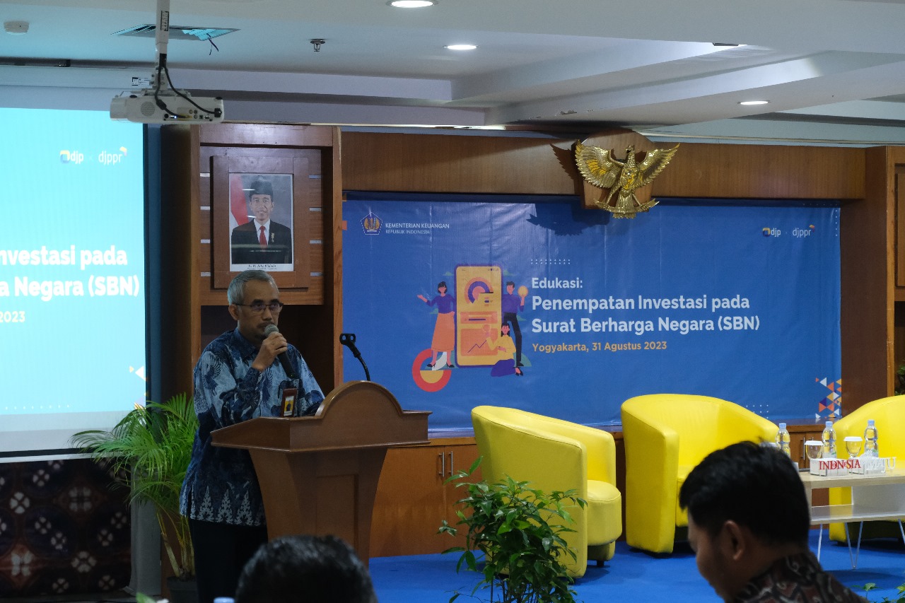 Kantor Wilayah Direktorat Jenderal Pajak (Kanwil DJP) Daerah Istimewa Yogyakarta (DIY) bekerja sama dengan Direktorat Jenderal Pengelolaan Pembiayaan dan Risiko (DJPPR) Kementerian Keuangan menyelengarakan sosialisasi penempatan investasi pada instrument Surat Berharga Negara (SBN) di Aula Yudhistira Lantai 7 Gedung Kanwil DJP DIY, Jalan Padjajaran (Ringroad Utara) No. 10, Kecamatan Depok, Kabupaten Sleman, D.I. Yogyakarta (Kamis, 31/8).