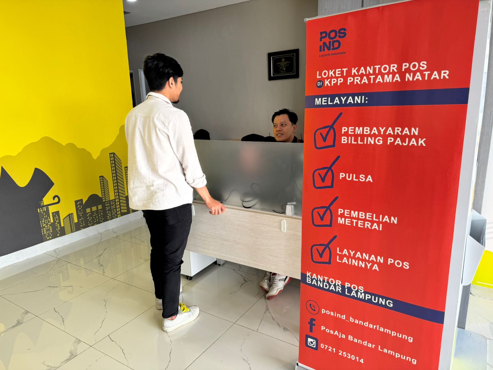 Kantor Pelayanan Pajak (KPP) Pratama Natar membuka layanan baru kepada wajib pajak di Loket Tempat Pelayanan Terpadu (TPT) KPP Pratama Natar, Kabupaten Lampung Selatan (Selasa, 21/1). Layanan baru ini merupakan hasil kerja sama dengan PT Pos Indonesia yang mencakup penyediaan berbagai fasilitas, seperti penjualan meterai, pembayaran pajak, pembelian pulsa, kuota internet, token listrik, pembayaran tagihan air, dan layanan pos lainnya.